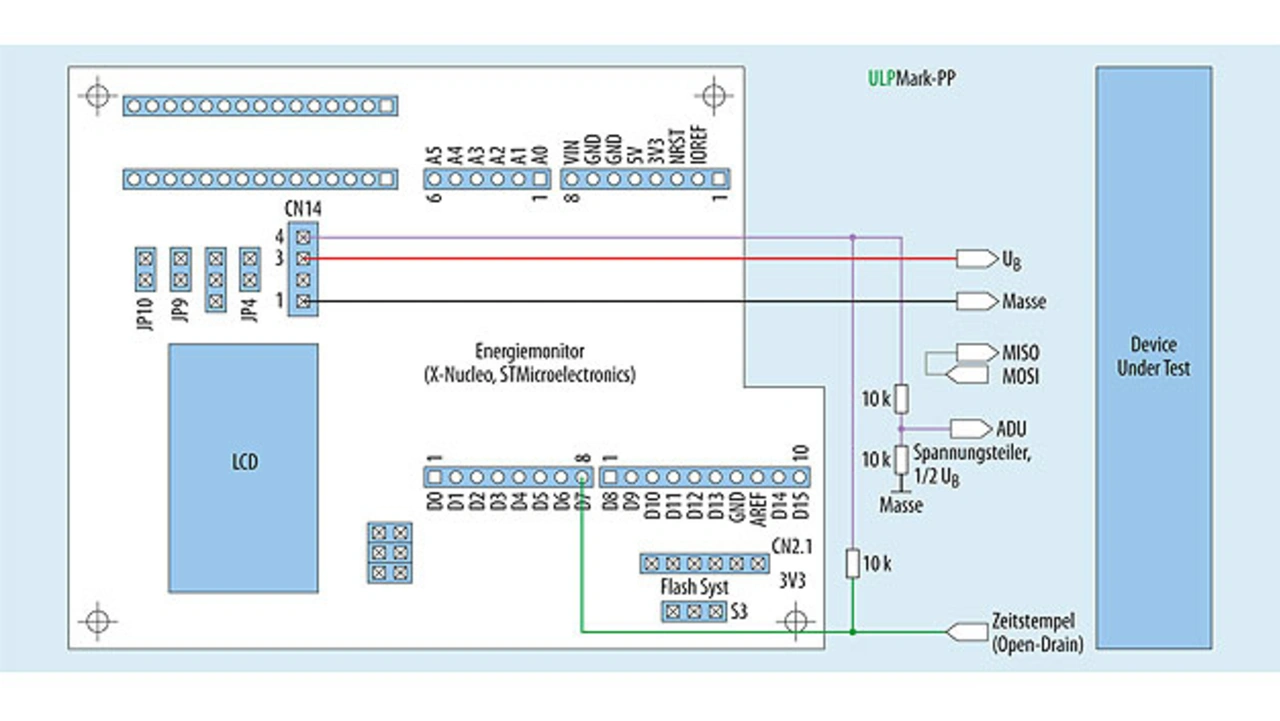 Des Weiteren ist für den SPI-Test eine SPI-Schleife – MISO- an MOSI-Pin – herzustellen und eine Referenzspannung (UB/2 ±10 %) für den A/D-Umsetzer des DUT von einer (Referenz-) Spannungsquelle anzulegen. Alternativ kann die Referenzspannung über einen Spannungsteiler vom UB-Anschluss des Energiemonitors abgenommen werden. Alles, was an UB angeschlossen ist, wird nicht mit in die Strommessung einbezogen.