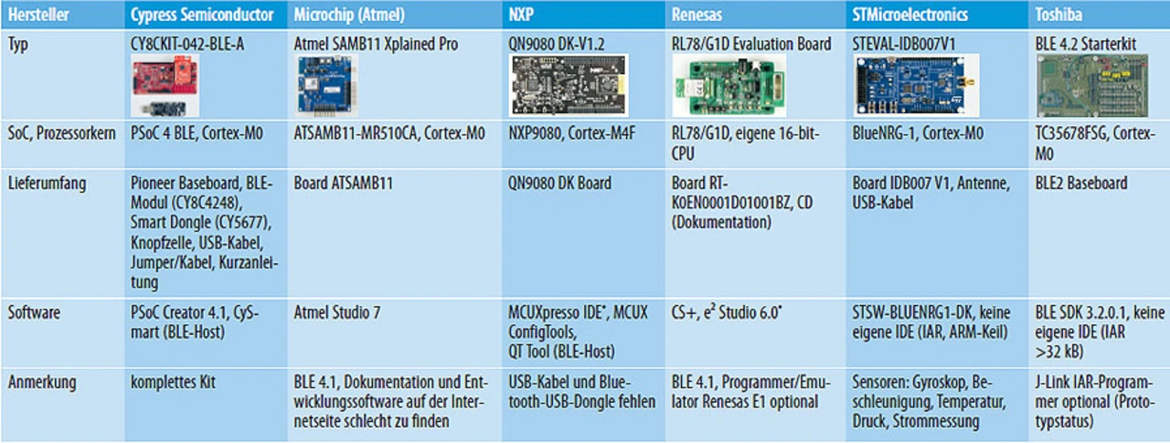 Bis auf die Entwicklungskits von Atmel/Microchip und Renesas (BLE 4.1) sind alle für das Elektronik-Projekt zur Verfügung gestellten Mikrocontroller BLE 4.2 spezifiziert. Ein komplettes Paket mit allem Drum und Dran hat eigentlich nur Cypress (CY8CKIT-042-BLE-A) geschnürt. Das andere Ende der Skala bildet das QN9080 Kit von NXP. Es soll laut Dokumentation wie das Kit von Cypress Semiconductor zwar einen separaten BLE-Host enthalten, der Lieferumfang besteht allerdings nur aus einer Platine, die in einer Antistatiktüte eingepackt ist.