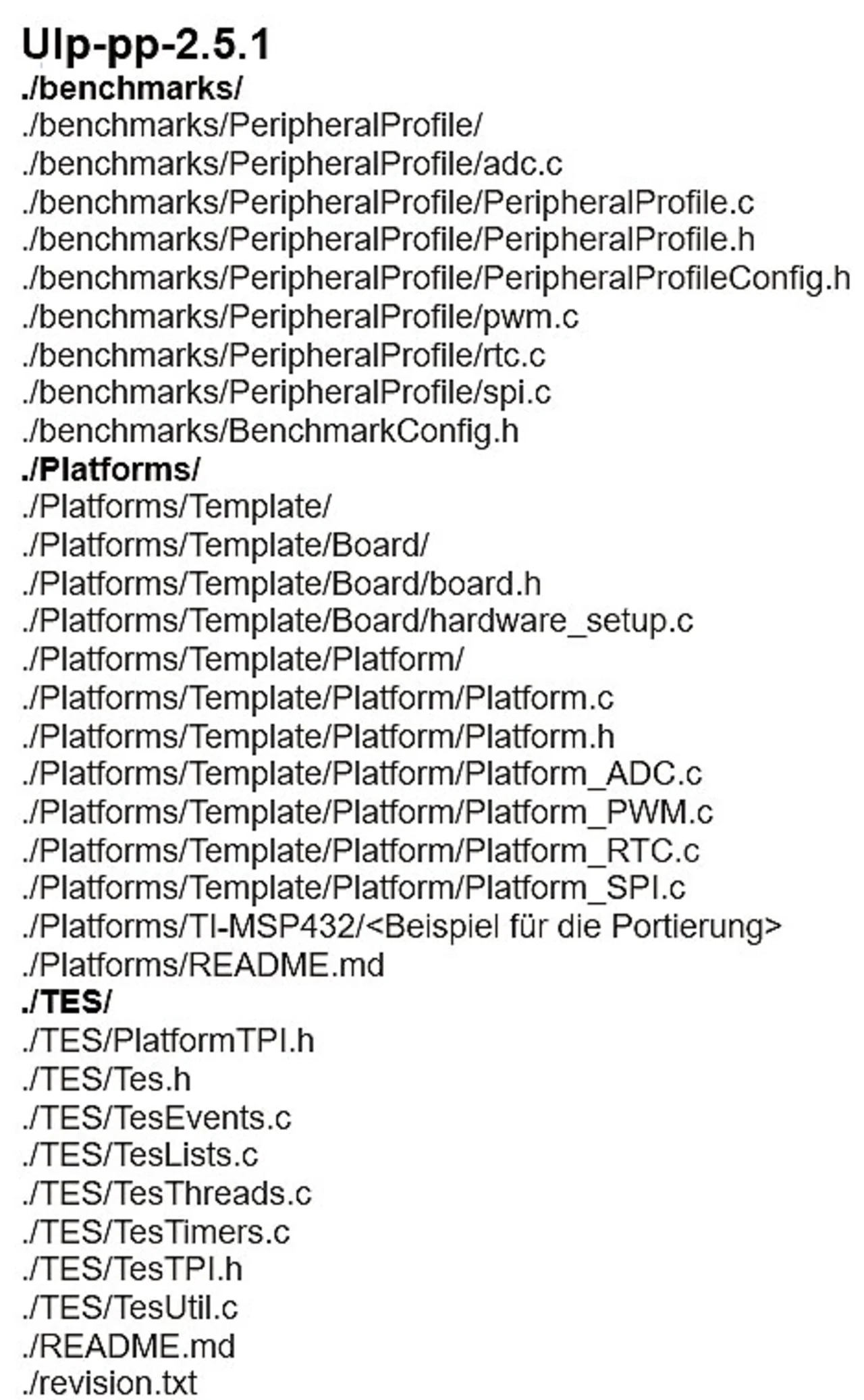 Der zweite Schritt ist die Anpassung des von EEMBC gelieferten Codes, d.h., es sind einige Einstellungen und Konfigurationen sowie Controller-spezifische Routinen für PWM, ADC, RTC und SPI zu programmieren, die im Verzeichnis Platforms untergebracht werden. Das Verzeichnis Template, mit den dort vorhandenen Dateien, dient als Vorlage für das eigene Projekt, wird entsprechend kopiert, umbenannt und mit den eigenen Einträgen bzw. Daten versehen. Das heißt, dass bei dieser Portierung die noch leeren Funktionskörper mit den für die jeweilige Funktion notwendigen plattformspezifischen Instruktionen gefüllt werden. In Bild 3 ist zur Übersicht die Verzeichnisstruktur von ULPMark-PP mit den dazugehörigen Dateien angegeben.