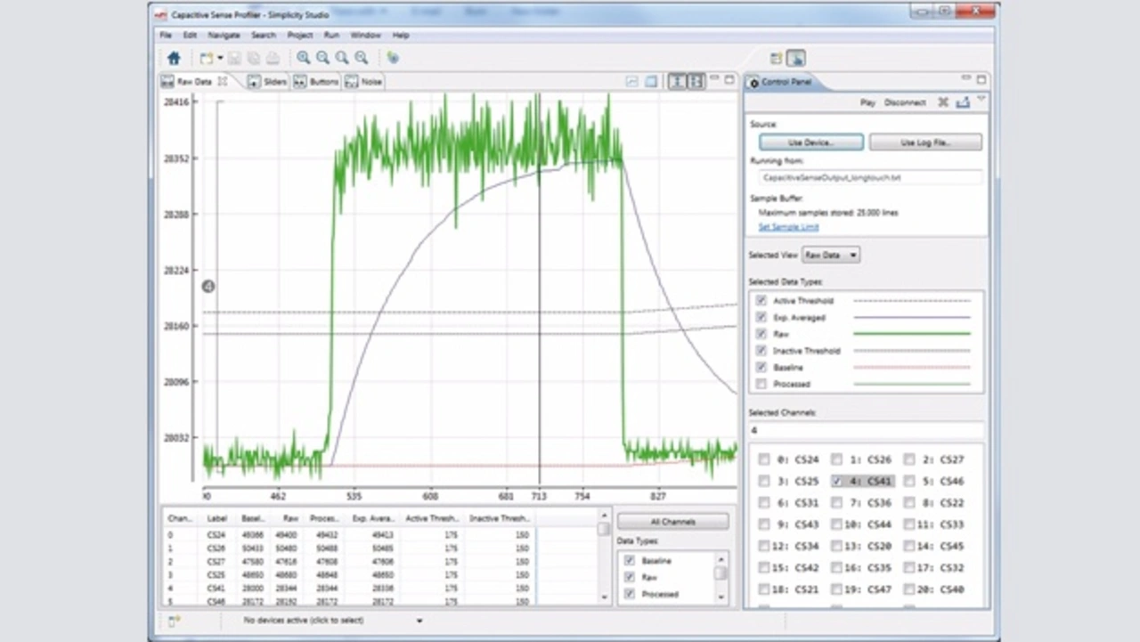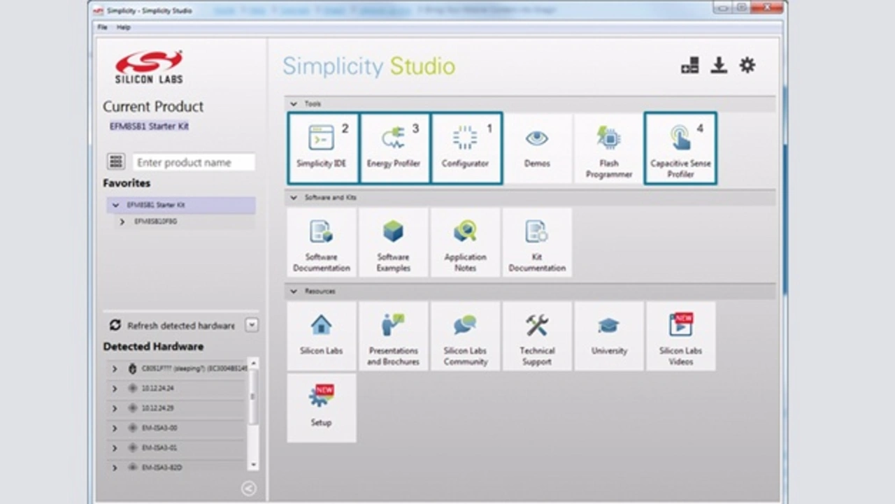 Eine integrierte Entwicklungsumgebung (IDE), zum Beispiel die Simplicity-Studio-Plattform von Silicon Labs, bietet eine durchgehende Entwicklungsunterstützung für Embedded-System-Designs, die für kapazitive Sensortechnik geeignet sind: von der Konfiguration und dem Import der Firmware-Bibliothek für kapazitive Sensorik bis hin zum systeminternen Debugging und der Echtzeit-Visualisierung des Ausgangs der kapazitiven Sensoren. Viele IDEs enthalten ein Startfenster, das Kacheln abhängig