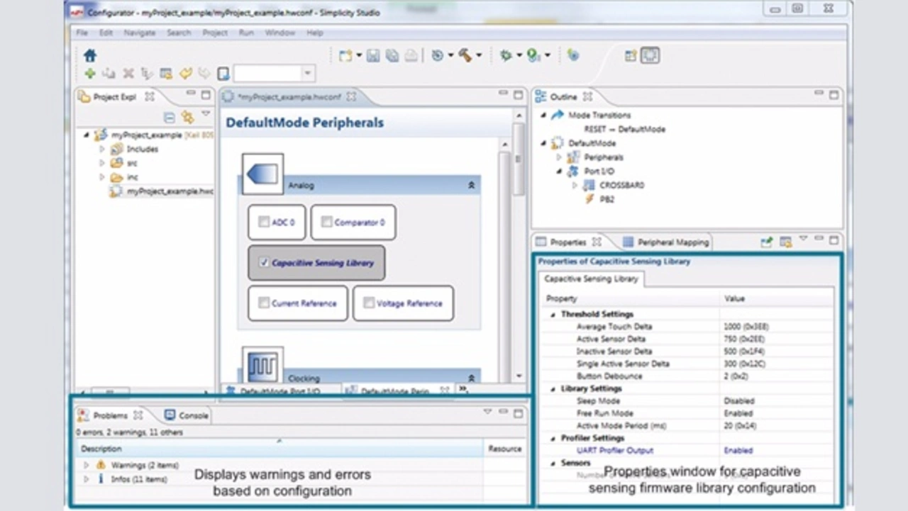 Die Entwicklung eines Projekts beginnt mit dem Konfigurator-Tool (Bild 2), mit dem die User in einem Fenster eine grafische Schnittstelle sowie Eigenschaften erhalten. In diesem Tool können Kunden Port-Pins als Eingänge für kapazitive Sensoren zuordnen und Einstellungen der Bibliothek konfigurieren, beispielsweise die Abtastdauer und die Stromspar-Funktion. Wenn die gewählten Konfigurationen eines Kunden die Implementierung anderer Konfigurationseinstellungen erforderlich machen, listet die Ansicht »Problemperspektiven« die entsprechenden Warnungen und Fehler auf. Man braucht nur auf diese Angaben zu klicken, um zu den spezifischen Einstellungen zu gelangen, die geändert werden müssen.