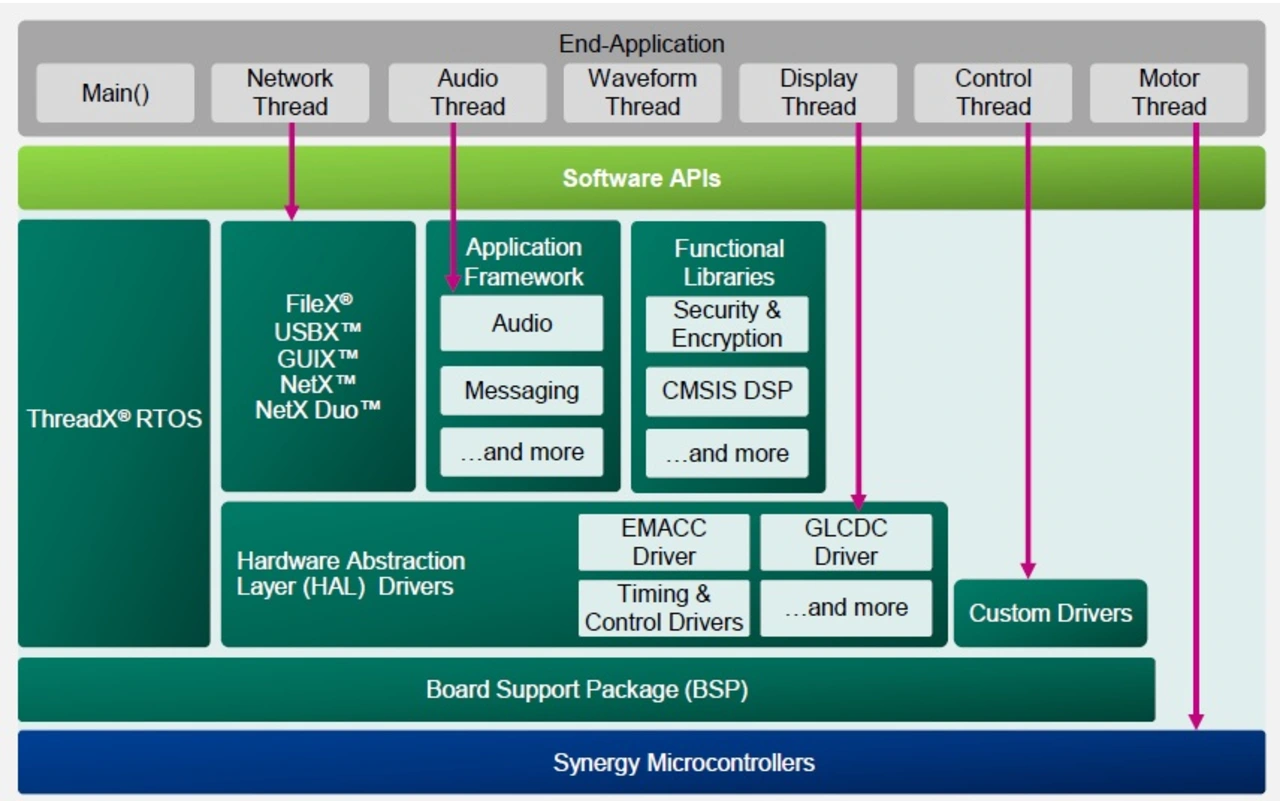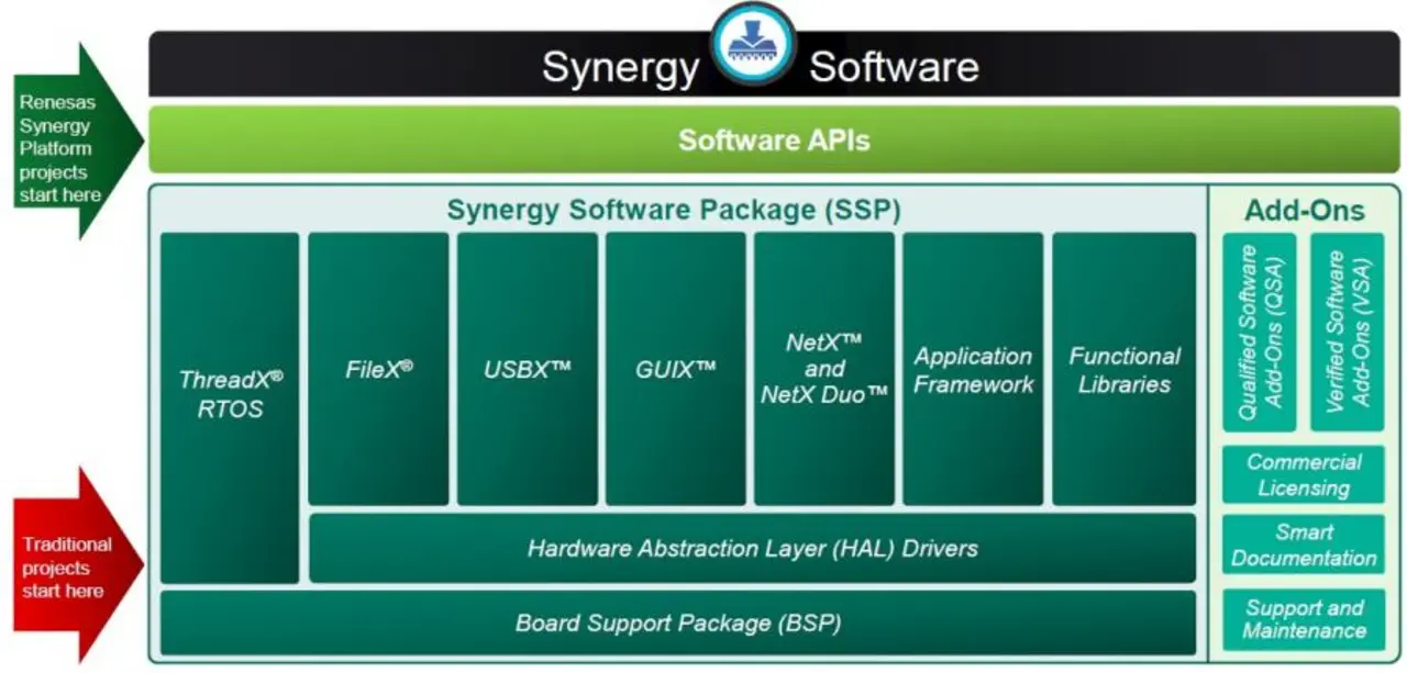 Das "Synergy Software Package" besteht aus von Renesas getesteter und qualifizierter Software, das über seine APIs Kompatibilität über alle Synergy-MCUs bereitstellt. Es beinhaltet u.a. Express Logic's X-Ware, die ihrerseits das Echtzeitbetriebssystem ThreadX, NetX-Middleware, NetX DUO IPV4 und IPV4/IPv6-TCP/IP-Stacks, den USB-Protokollstack USBX für Host/Device/OTG, das MS-DOS-kompatible Dateisystem FileX und die Grafik-Runtime-Bibliothek GUIX enthält. Diese Komponenten sind in ein Applikations-Framework eingebunden, das den IEC/ISO/IEEE-12207-Software-Lebenszyklus-Prozess-Standards genügt.