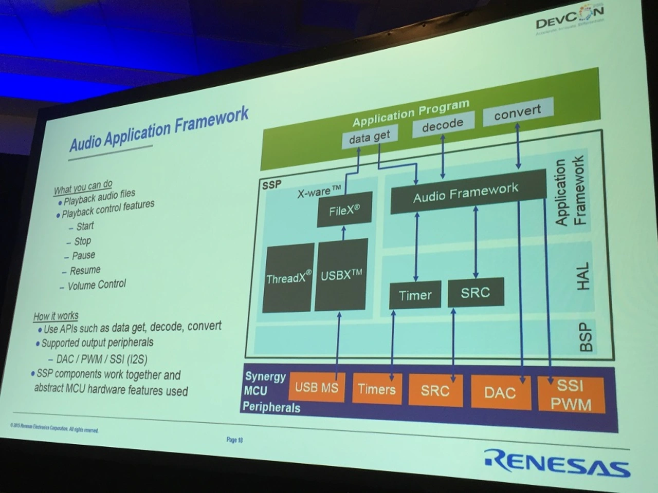 Bild 5 zeigt eine praktische Anwendung des Frameworks aus dem Bereich Audio. Um Audiodatein abzuspielen und dies über "Start", "Stop", "Pause", "Lautstärkeregelung" zu steuern, werden auf Chipebene Timer, USB, D/A-Wandler, PWM und SRC benötigt. Statt diese nun jede Peripherie einzeln programmieren zu müssen, kann der Entwickler einfach die APIs "Daten holen", "Dekodieren" und "Konvertieren" aufrufen, die ihrerseits über das SW-Framework die genannten IP-Blöcke auf dem Chip steuern.