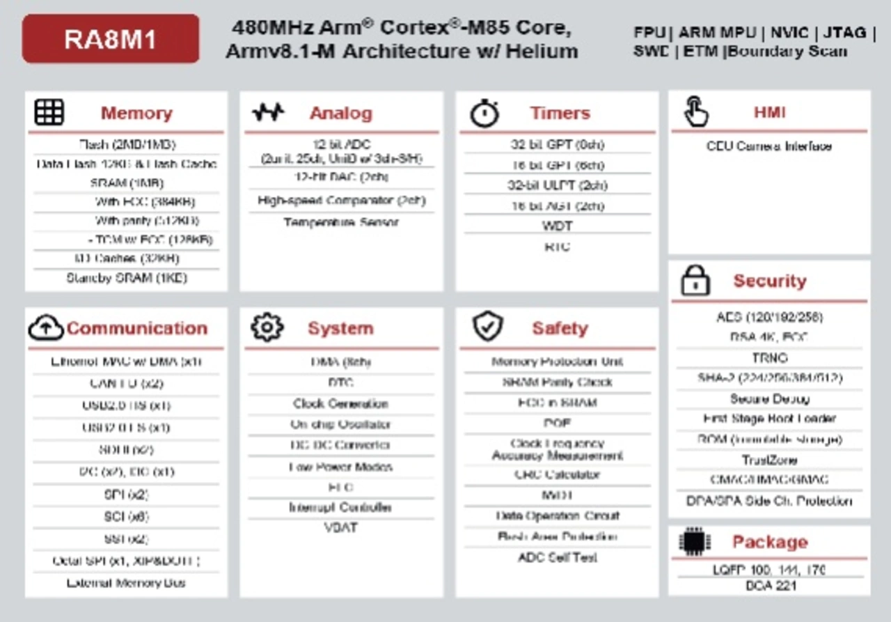 Dieses bietet einen Schutz vor Software-Angriffen, die auf Verletzungen der Speichersicherheit und Speicherbeschädigungen abzielen. Die RA8-Serie strebt außerdem Zertifizierungen nach PSA Certified Level 2 + Secure Element (SE), NIST CAVP und FIPS 140-3 an.