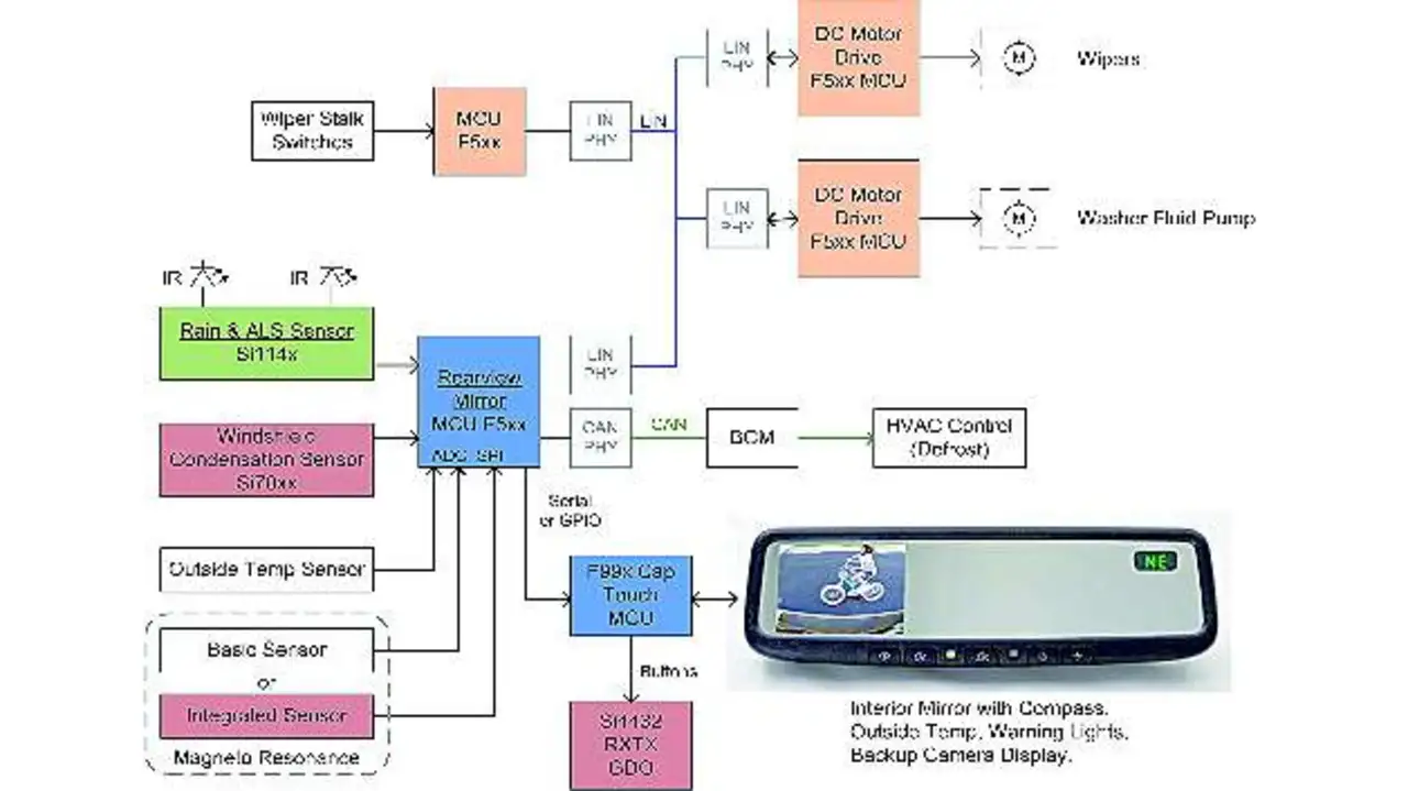 Die Kombination aus Windschutzscheiben- und Spiegelsystem steuert eine 8-Bit-Mixed-Signal-MCU, die als Schnittstelle dient sowie die Steuerung und Datenanalyse für die Regenerkennung, Außentemperatur, Glaskondensation, Kompasssensoren, automatische HVAC-Windschutzscheiben-Abtaufunktion und ADAS-Funktionen übernimmt. Bild 1 zeigt mögliche Bestandteile eines elektronischen Windschutzscheiben- und Rückspiegelsystems.