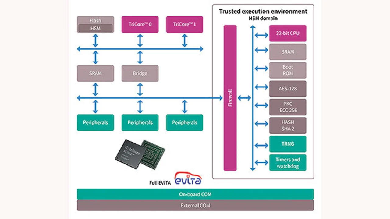 Das HSM (Bild 5) ermöglicht die asymmetrische Verschlüsselung gemäß ECC256 und SHA256, eine Authentifizierung der Nachrichten zwischen verschiedenen ECUs und das sichere Booten zum Schutz vor Schadsoftware. Es basiert auf einer 32-bit-CPU von Arm und ist vom restlichen Aurix-IC durch eine Firewall separiert. Das HSM macht die IC-interne Kommunikation sicherer und erschwert Hardware-Manipulationen, wie beispielsweise Motor-Tuning. Außerdem unterstützen die TC3xx-Mikrocontroller effiziente und sichere Software-Updates-Over-Air (SOTA) und helfen Software-Hijacking zu verhindern.