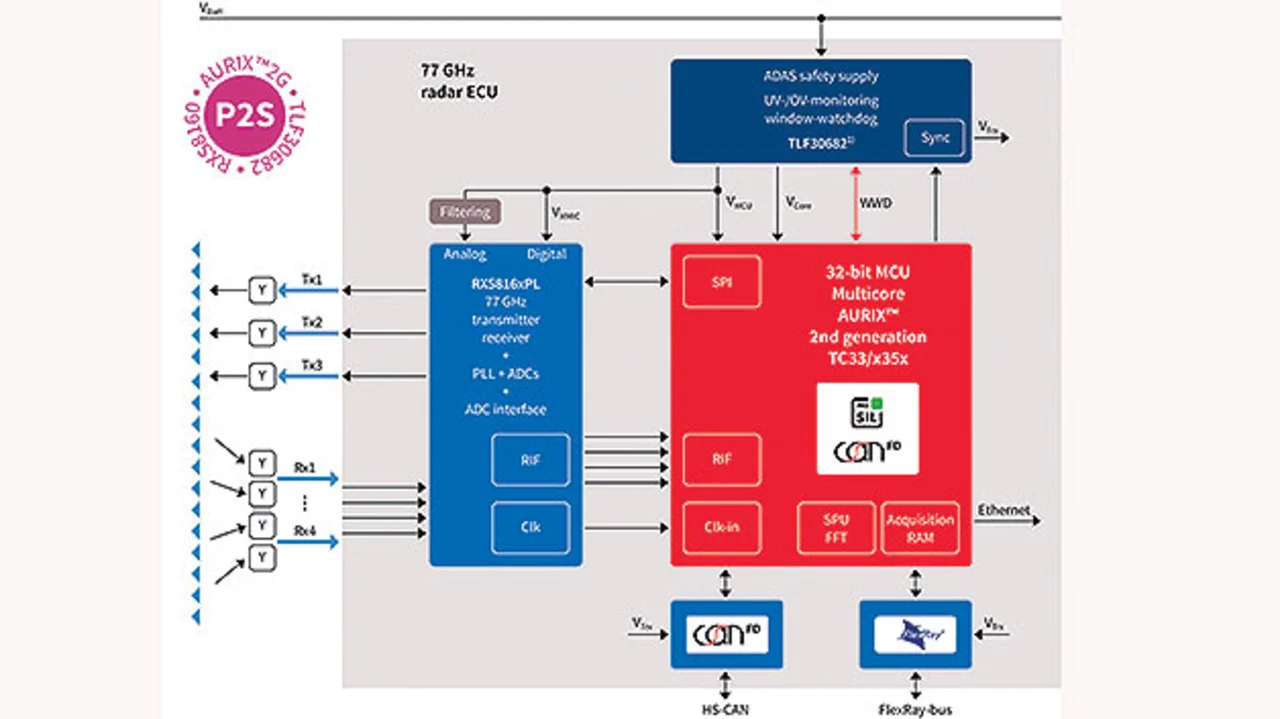 Die TC3xx-Mikrocontroller bieten dafür die bereits erwähnte Radar-Recheneinheit mit bis zu zwei Signal Processing Units (SPU), die die höchsten Safety-Anforderungen unterstützen. Diese arbeiten mit einer Taktfrequenz von 300 MHz und ermöglichen die Berechnung von neuesten Radar-Algorithmen auf einem einzigen IC mit sehr geringer Stromaufnahme im Vergleich zu herkömmlichen GPUs/DSPs. Über die digitale Radarschnittstelle lassen sich HF-Radar-ICs direkt und mit hoher Datenübertragungsrate mit dem Mikrocontroller verbinden.
