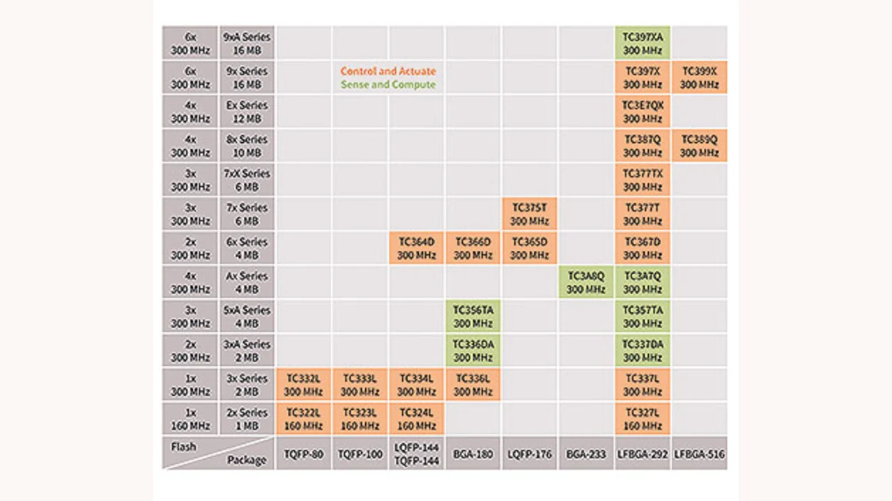 Unterschiedlich leistungsfähige Derivate der TC3xx-Mikrocontroller in identischen Gehäusen bieten dem Entwickler Skalierbarkeit und Flexibilität, wobei Software-Kompatibilität über die gesamte TC3xx-Mikrocontrollerfamilie gegeben ist. Außerdem ist auch das Safety-Konzept grundsätzlich beibehalten worden.