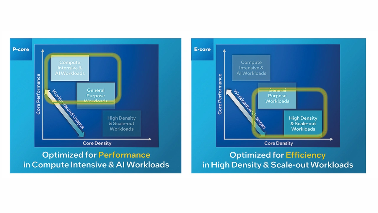 All das will Intel mit seinen neuen Prozessoren abdecken: P-Core ist auf höchste Rechenleistung getrimmt und adressiert damit rechenintensive und KI-Arbeitslasten, E-Core wiederum ist laut Ryan Tabrah, GM für die Xeon-E-Core-Produkte bei Intel, darauf ausgerichtet, eine extrem hohe Rechendichte auf möglichst energieeffiziente Weise zu liefern. Tabrah weiter: »Obwohl wir bei E-Core leichte Modifikationen vorgenommen haben, um diese Rechenleistung effizient mit einer hohen Leistung pro Watt, einer hohen Kerndichte und einem hohem Durchsatz zu erreichen, haben wir noch einen anderen wichtigen Punkt erreicht, das zeigt das Feedback unserer Kunden: diese beiden Prozessoren haben viel gemeinsam.« Dazu zählt der Intel-Manager beispielsweise die gleichen Sockel, beide werden mit demselben Chiplet-Ansatz umgesetzt, beide Prozessoren verfügen über die gleichen I/Os, die gleichen Speicher oder die gleiche Firmware.