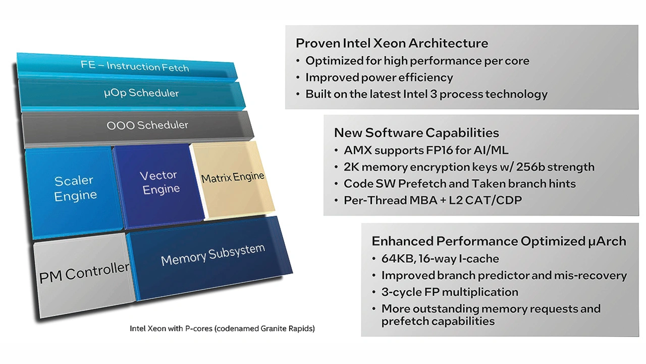 Um den P-Core auf höchste Rechenleistung zu trimmen, hat Intel auf diverse Ansätze gesetzt. Dazu gehört beispielsweise ein 64 KB großer I-Cache und eine verbesserte Sprungvorhersage. Darüber hinaus ist es dem Unternehmen gelungen, die notwendige Zyklenanzahl für Gleitkommamultiplikationen von bislang 4 bis 5 auf 3 Zyklen zu drücken. Außerdem unterstützt die integrierte Matrix-Engine jetzt auch das FP16-Format für KI- und ML-Anwendungen (Machine Learning). In Hinblick auf Security unterstützen die neuen Granite Rapids jetzt 256 bit große Codierungsschlüssel.