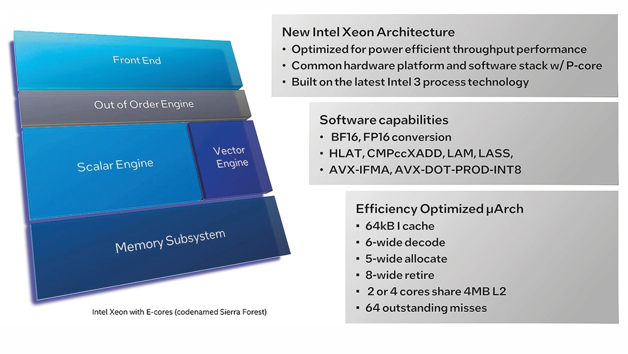 Beim E-Core geht es um Durchsatz und Effizienz, dementsprechend sehen die Optimierungen zum Teil etwas anders aus. In einem Punkt sind P- und E-Core gleich: Auch der E-Core ist mit einem 64 kB großen I-Cache ausgestattet. Dazu kommen beim E-Core noch 6-Wide-Decode-, 5-Wide-Allocate- und 8-Wide-Retire-Einheiten, um den Durchsatz zu erhöhen. Der L2-Cache ist 4 MB groß, den sich zwei oder vier Kerne teilen. Die E-Cores unterstützen BF16-Datentypen sowie verschiedene Befehle wie LAM (Linear Adress Masking), HLAT (Hypervisor-Managed Linera Adress Translation) oder CMPccXADD (Compare and Add if Condition is Met) sowie AVX-IFMA und AVX-DOT-PROD-INT8.