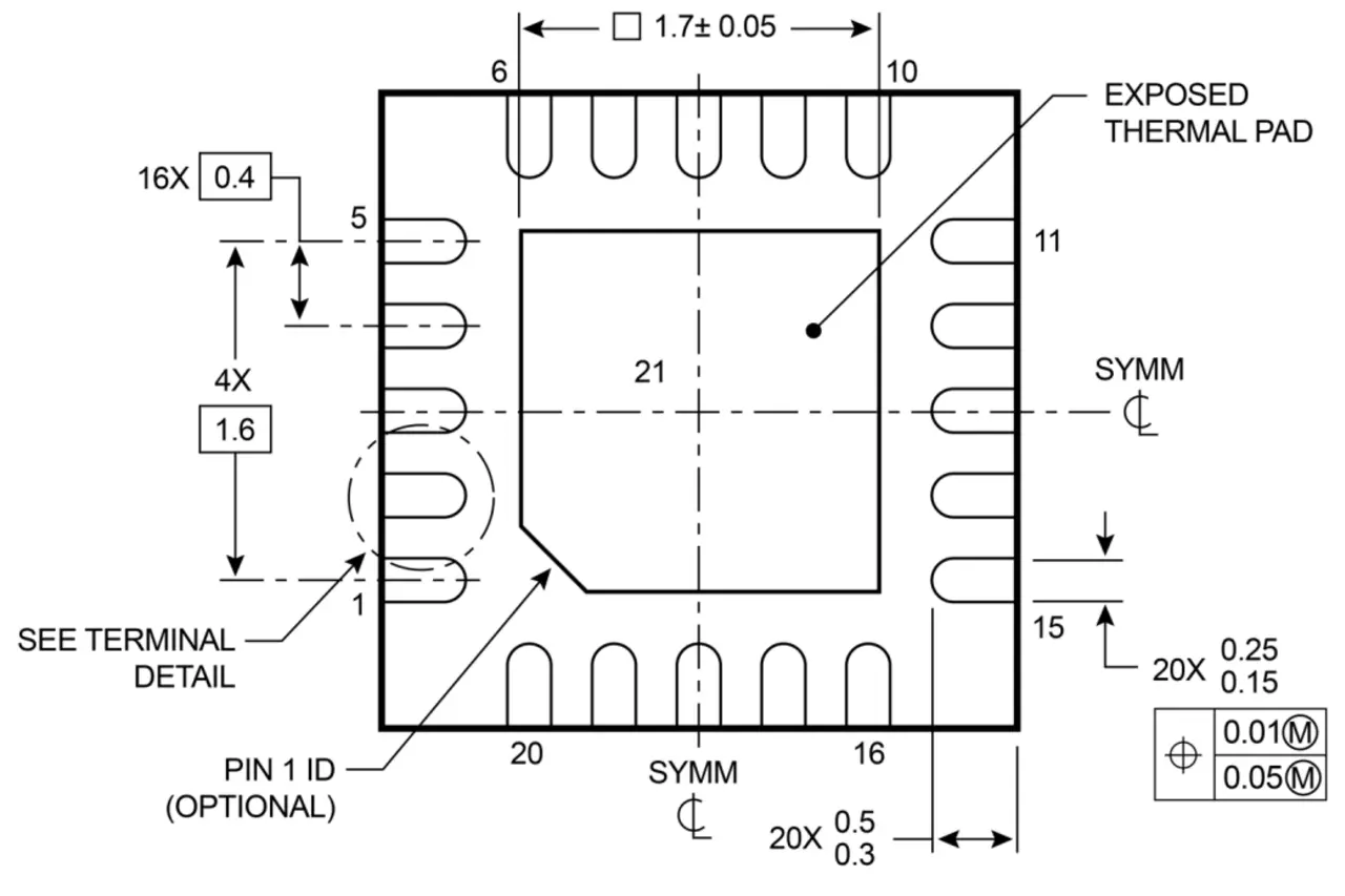 Quad Flat No-lead (QFN) – anstelle von traditionellen herausgeführten Anschlüssen ist ein QFN-Gehäuse mit flachen Kontakten an den Rändern seines Kunststoffgehäuses ausgestattet. Seine thermischen Eigenschaften werden durch eine eigene Wärmableitfläche an der Unterseite verbessert. Bild 1 zeigt als Beispiel das nur 9 mm² messende, 20 Kontakte aufweisende Gehäuse des Mikrocontrollers MSPM0C1104.