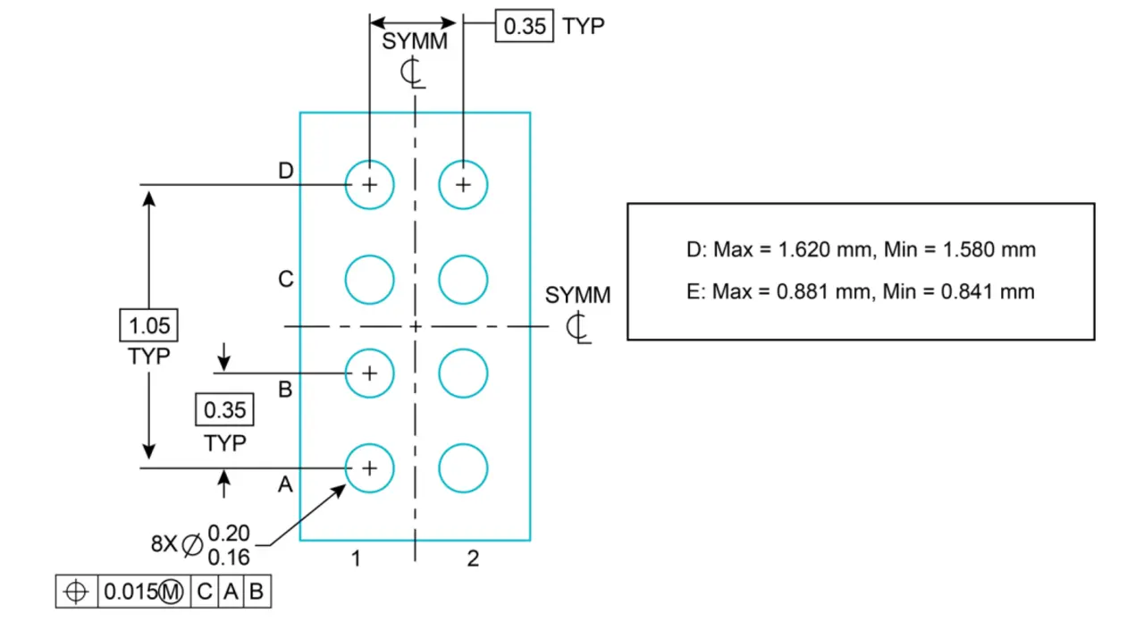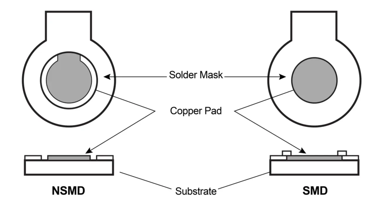 Beim Design mit Wafer-Chip-Scale-Gehäusen sind zwei Arten von Anschlussflächen (Land Patterns) gängig: SMD (Solder Mask Defined; dt.: Lötmasken-definiert) und NSMD (Non-Solder Mask Defined; dt.: Nicht-Lötmasken-definiert) - siehe Bild 6. SMD-Varianten verfügen über eine größere Kupferfläche, die sich mit dem Substrat überlappt, während NSMD-Pads (Non-Solder Mask Defined) kleinere Kupferflächen mit engeren Toleranzen aufweisen. NSMD-Pads bieten eine gleichmäßigere Lötverteilung, ermöglichen eine bessere Leiterbahnführung und reduzieren mechanische Spannungen bei Chip-Scale-Gehäusen.