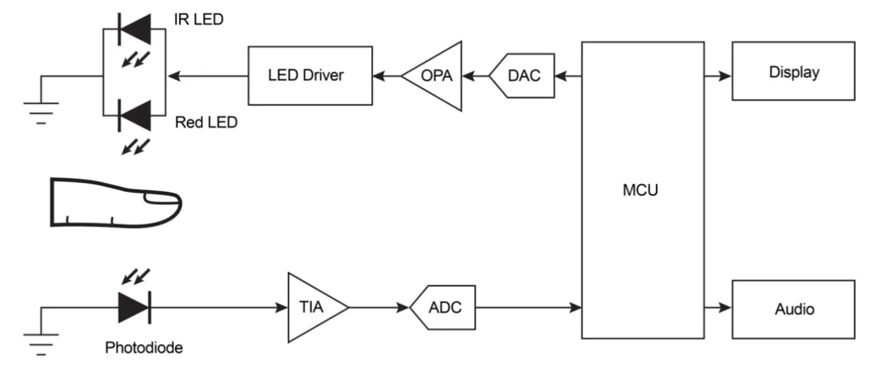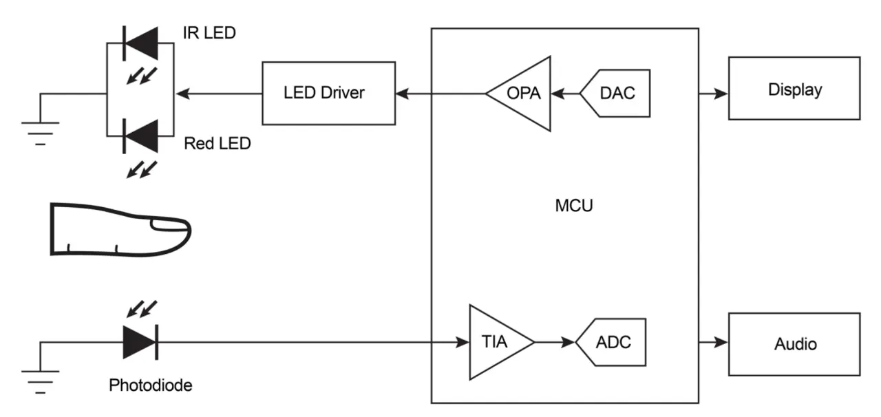 MCUs und Prozessoren mit integrierten analogen und digitalen Peripheriefunktionen können die Miniaturisierung deutlich vorantreiben. Das lässt sich am Beispiel eines Pulsoximeters deutlich machen. Verglichen mit einem diskreten Design-Ansatz, wie in Bild 3 dargestellt, kann eine MCU mit integriertem A/D-Wandler (ADC), Komparator und Spannungsreferenz die Zahl der benötigten Bauelemente deutlich reduzieren, und damit auch die Leiterplattenfläche verringern, wie Bild 4 verdeutlicht.