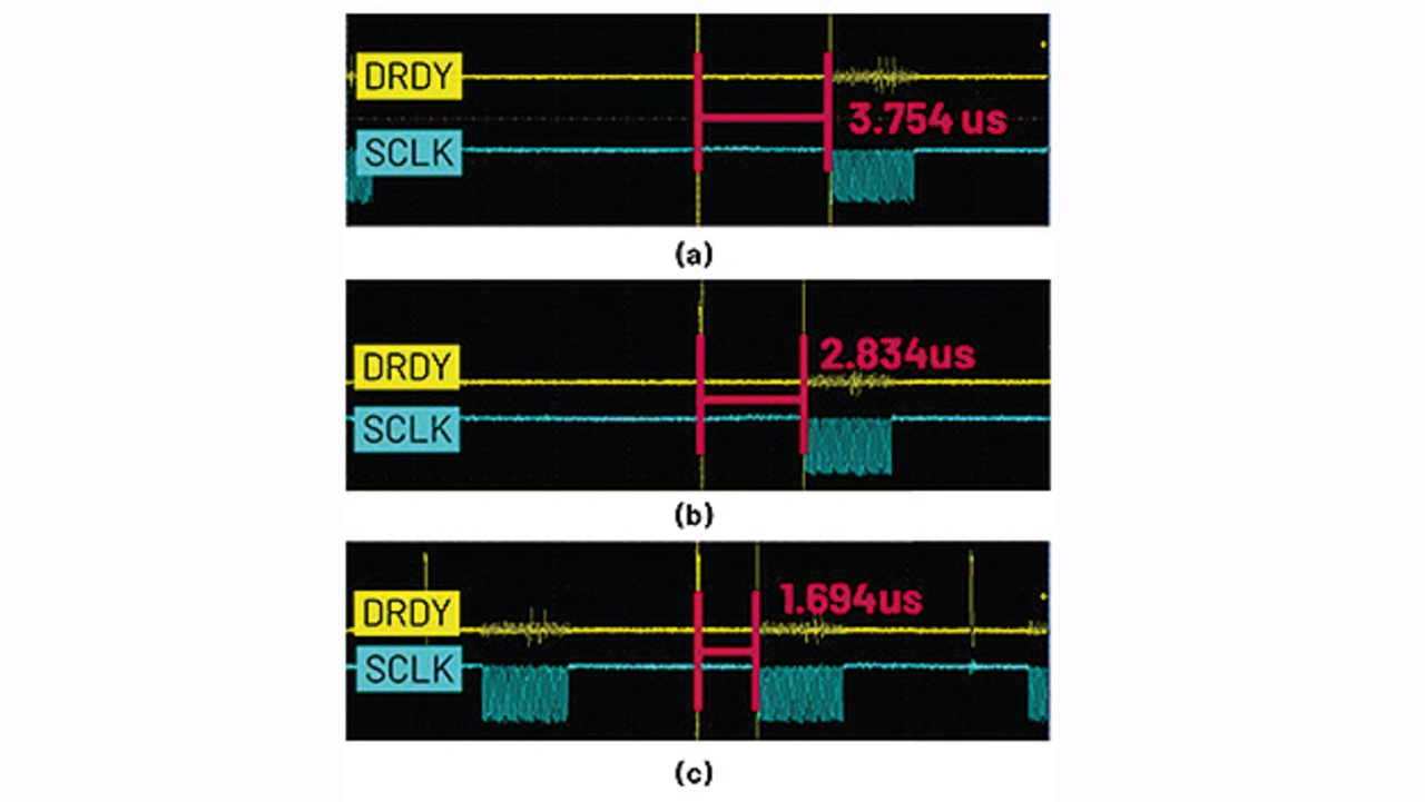Die Methoden a) und b) eignen sich für Ausgangsdatenraten (ODR) von 64 kHz, während Methode c) ein ODR von bis zu 128 kHz unterstützt. Der ∆t-Wert von Methode c) ist am kürzesten, sodass SCLK früher enden kann. Wenn das SCLK-Signal (d. h. die Datentransaktion) zurückgenommen wird, bevor die Hälfte der ADC-Ausgangsdatenperiode verstrichen ist, kann die ODR vervielfacht werden. Verglichen mit der ODR-Geschwindigkeit von 8 kHz beim ADI-SPI-Treiber stellt dies eine enorme Verbesserung dar.