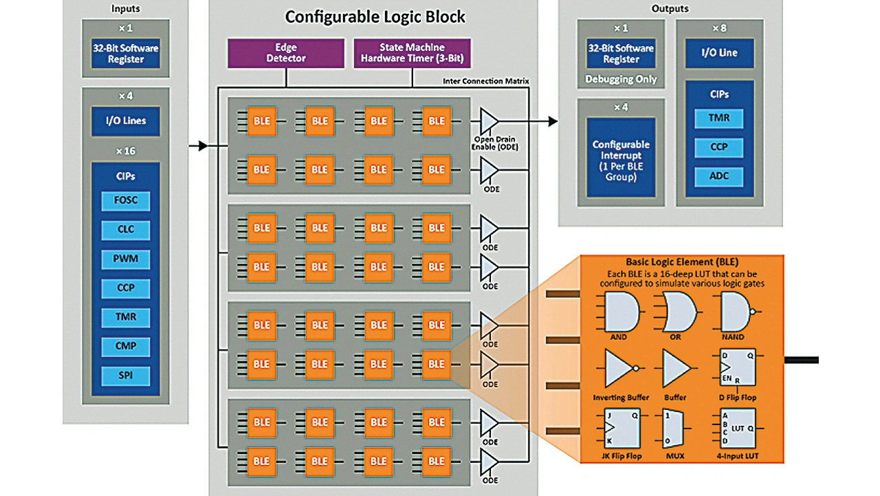 Das CLB-Modul im PIC16F13145 besteht aus vier Logikgruppen mit jeweils acht BLEs (Basic Logic Elements). Die BLEs der Logikgruppen sind miteinander verbunden – jede Logikgruppe stellt zwei GPIO-Ausgänge und einen optionalen Interrupt für die CPU dar. Bei einer Betriebsspannung von 5,5 V haben die BLEs eine typische Ausbreitungszeit (Input to Output) von weniger als 6 ns. Alle BLEs teilen sich einen gemeinsamen Taktgeber, der zusammen mit einem optionalen Taktteiler per Software konfiguriert wird. Der CLB kann eine der internen Taktgeberquellen der MCU oder eine extern bereitgestellte Quelle verwenden.
