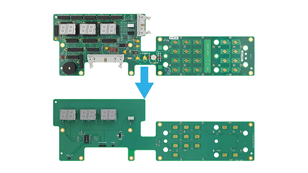 Dieses Beispiel wurde intern für eine neue Steuerplatine für ein Zeitmesssystem verwendet. Die ursprüngliche Benutzeroberfläche wurde in den 1980er-Jahren mit Logik der 74HC-Serie entwickelt. Mit dem CLB kann eine einzelne 20-polige MCU die auf der Platine vorhandene Anzeige- und Tastaturlogik implementieren, was die Stückliste erheblich reduziert. Ein Vergleich der beiden Platinen ist in Bild 3 dargestellt.