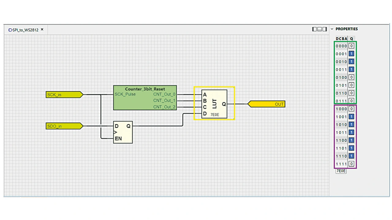 Hier wird dies mithilfe eines mono-getriggerten 3-bit-Zählers, eines D-Latch mit Enable und einer 4-Eingangs-LUT umgesetzt (Bild 4). Entscheidend bei der Implementierung sind die Taktquellen für SPI und CLB. Der SPI-Taktgeber ist auf (Leerlauf) HIGH eingestellt, ändert seinen Zustand bei steigender Flanke und läuft mit einer Frequenz von 800 kHz (Ausgang des WS2812), während der CLB-Taktgeber mit der 10-fachen Geschwindigkeit (8 MHz) läuft. Wenn SCLK auf LOW ist, wird der 3-bit-Zähler ausgelöst und beginnt zu zählen. Erreicht der 3-bit-Zähler 7 (0b111), stoppt er und bleibt bis zur nächsten niedrigen Periode des Taktimpulses auf 0.