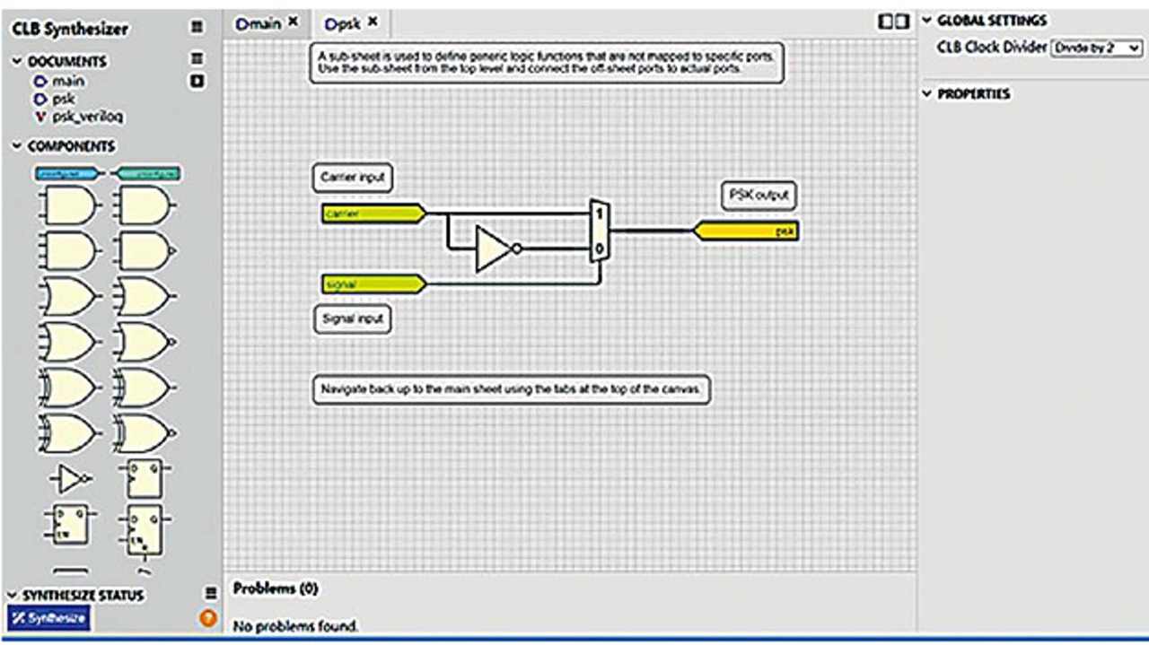 Da das CLB-Modul wesentlich komplexer ist als CLC- oder CCL-Elemente, wurde ein neues Tool entwickelt. Der »CLB-Synthesizer« bietet eine grafische Oberfläche zur Konfiguration der Logik (Bild 2). Neben Logikgrundelementen unterstützt das Tool auch Bibliotheken mit Logikblöcken höherer Ebene, die bereits vorhanden sind oder vom Benutzer selbst erstellt werden können.