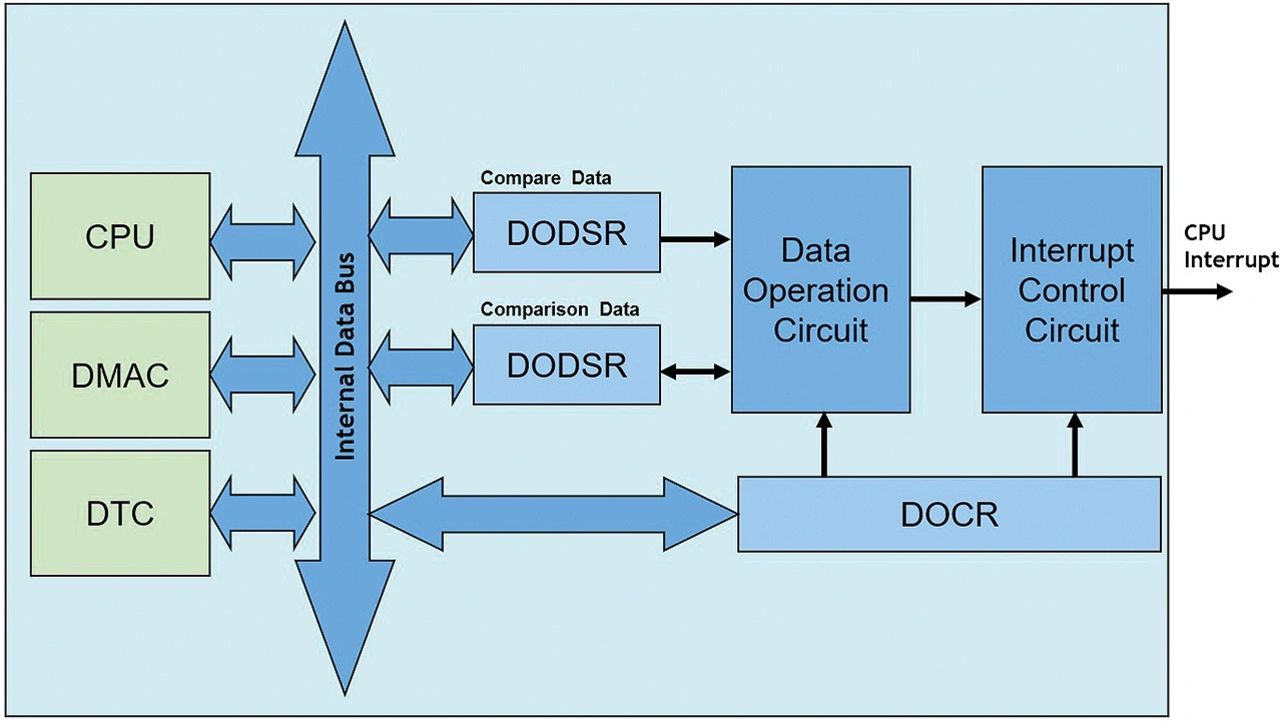 Das Herzstück des DOC ist eine einfache ALU (arithmetische Logikeinheit). Diese ALU führt nur drei grundlegende Funktionen aus: Sie kann einen 16-bit-Datenvergleich, eine 16-bit-Addition oder eine 16-bit-Subtraktion durchführen und dann einen Interrupt aufgrund einer bestimmten Ausgangsbedingung erzeugen. Diese Funktionen lassen sich alle ohne Intervention der CPU ausführen. Dies erfolgt durch die automatische Übertragung der vom DOC zu verarbeitenden Daten mittels DMAC (DMA-Controller) oder eines DTC (Data Transfer Controller). Siehe hierzu Bild 1.