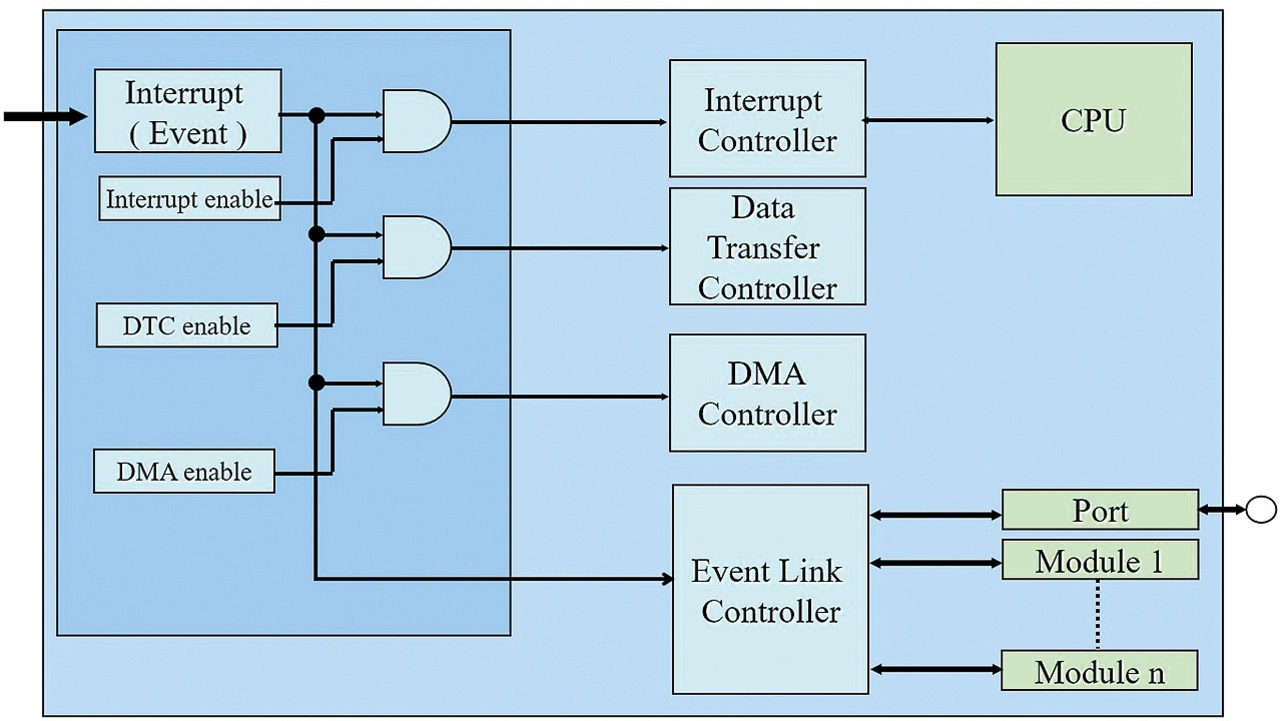 Bei der RA-Familie kann ein Event (oder Interrupt), das von der CPU, einer Peripheriekomponente oder einem externen Pin ausgelöst wird, mehrere Aktionen auf dem Baustein auslösen. Bild 2 zeigt ein vereinfachtes Diagramm des Interrupt-Controllers. Es veranschaulicht, wie ein Event (Ereignis) mehrere Aktionen auslösen kann. Dazu gehören ein herkömmlicher Interrupt, der den Programmablauf der Anwendung ändert, eine DMAC- oder eine DTC-Übertragung. Es ist auch möglich, mehr als eine dieser Aktionen durch ein einziges Event auszulösen.