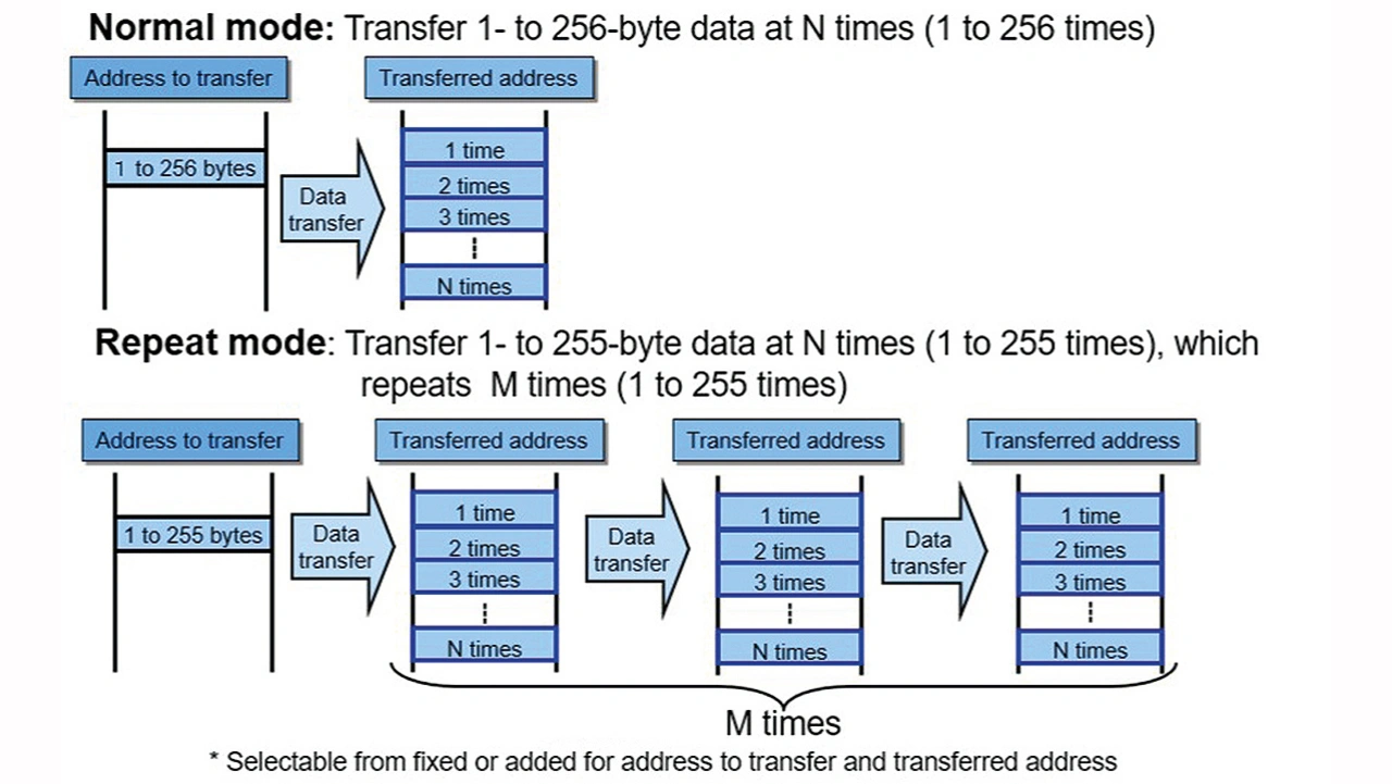 Der DTC kann ein Byte oder mehr zwischen Peripherie und Speicher oder Speicher und Peripherie bis zu 256-mal übertragen. Die Quell- und die Zieladresse für die Übertragung können jeweils gleich sein oder unabhängig voneinander inkrementiert oder dekrementiert werden. Dadurch entsteht eine Pufferstruktur im Speicher.