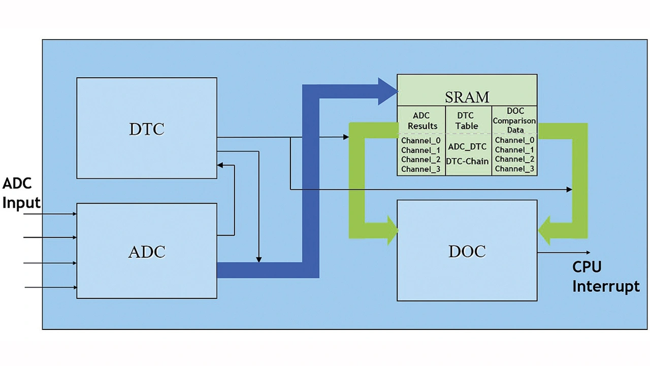 Nun folgt abschließend ein Blick darauf, wie sich DTC und DOC mit dem ADC kombinieren lassen, um ein »intelligentes« analoges Sampling-System zu entwickeln. Dies kann die Anforderungen an die CPU verringern und sogar die Leistungsaufnahme senken. Hierfür wird die CPU in den Ruhezustand versetzt, während ADC, DTC und DOC arbeiten. Das hier als Beispiel zu erstellende System ist ein einfacher Pegeldetektor mit mehreren Eingängen, der den Group-Scan-Modus des 12-bit-ADC nutzt, um jedes der vier Eingangssignale nacheinander abzutasten. Die Kombination aus DTC und DOC erkennt, ob ein programmierbarer Schwellenwert überschritten wird. Das System erzeugt nur dann einen Interrupt und weckt die CPU auf, wenn dieser Wert überschritten wurde.