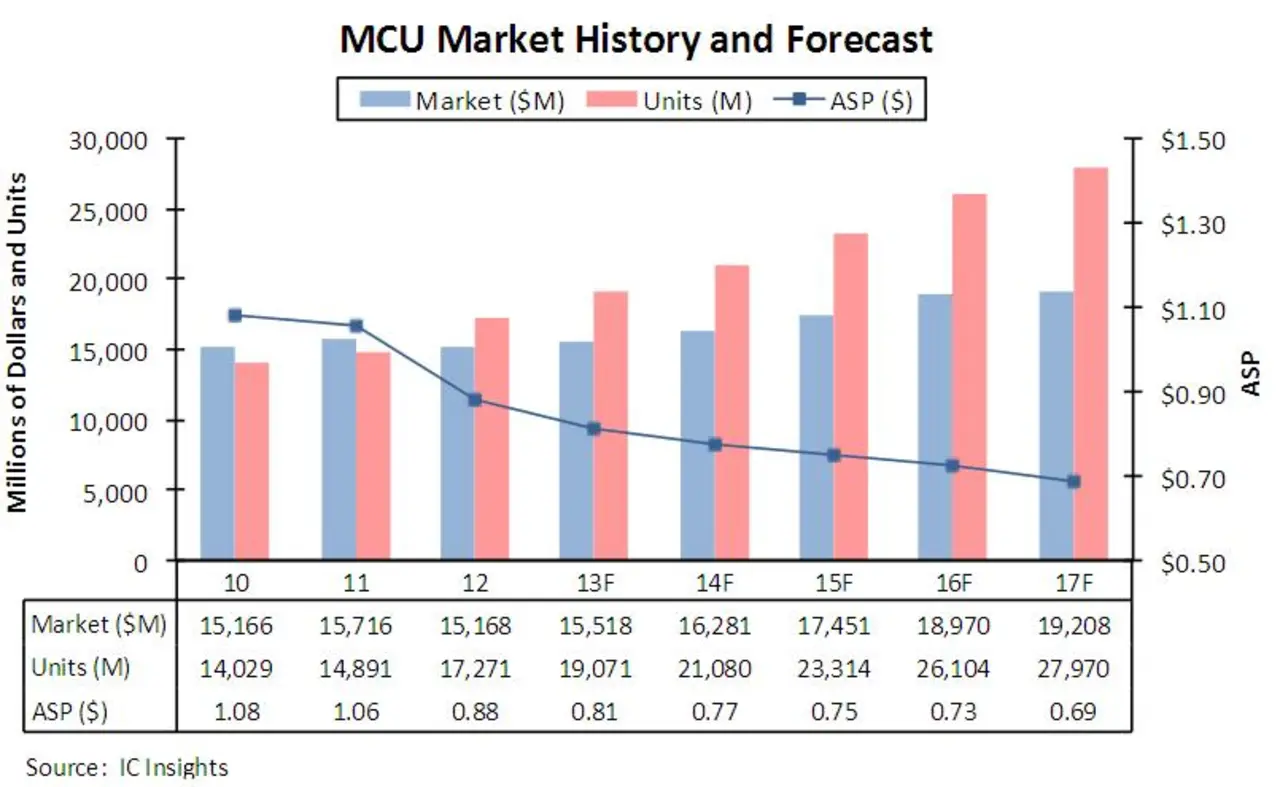 Während die Unsicherheit über die globale Wirtschaft eine Rolle bei dem Rückgang des MCU-Umsatz spielte, wurde der Markt von einer Peis-Erosion im Jahr 2012 getroffen, als die Hersteller massiv in 32-Bit-Chips investiert haben. Der 17%ige Rückgang der ASPs war der schlimmste Preisverfall seit den 1980er Jahren.