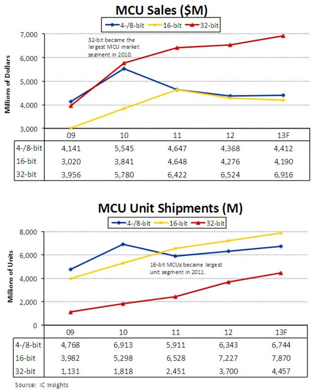 In Bezug auf die Stückzahlen lösten die 16-Bit-Controller die 8-Bitter im Jahr 2011 als größtes Segment ab. Das zahlenmäßige Wachstum von 16-Bit-MCUs um 11% im Jahr 2012 nach einer Steigerung von 23% im Jahr 2011 basiert zum Teil auf der Stärke des Automotive-Marktes. Im Jahr 2013 werden 16-Bit-Auslieferungen voraussichtlich um 9% auf 7,9 Milliarden Einheiten steigen. Auslieferungen von 4-/8-Bit-MCUs werden 2013 voraussichtlich um 6% auf 6,7 Mrd. Einheiten wachsen.