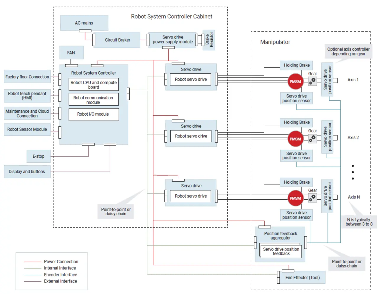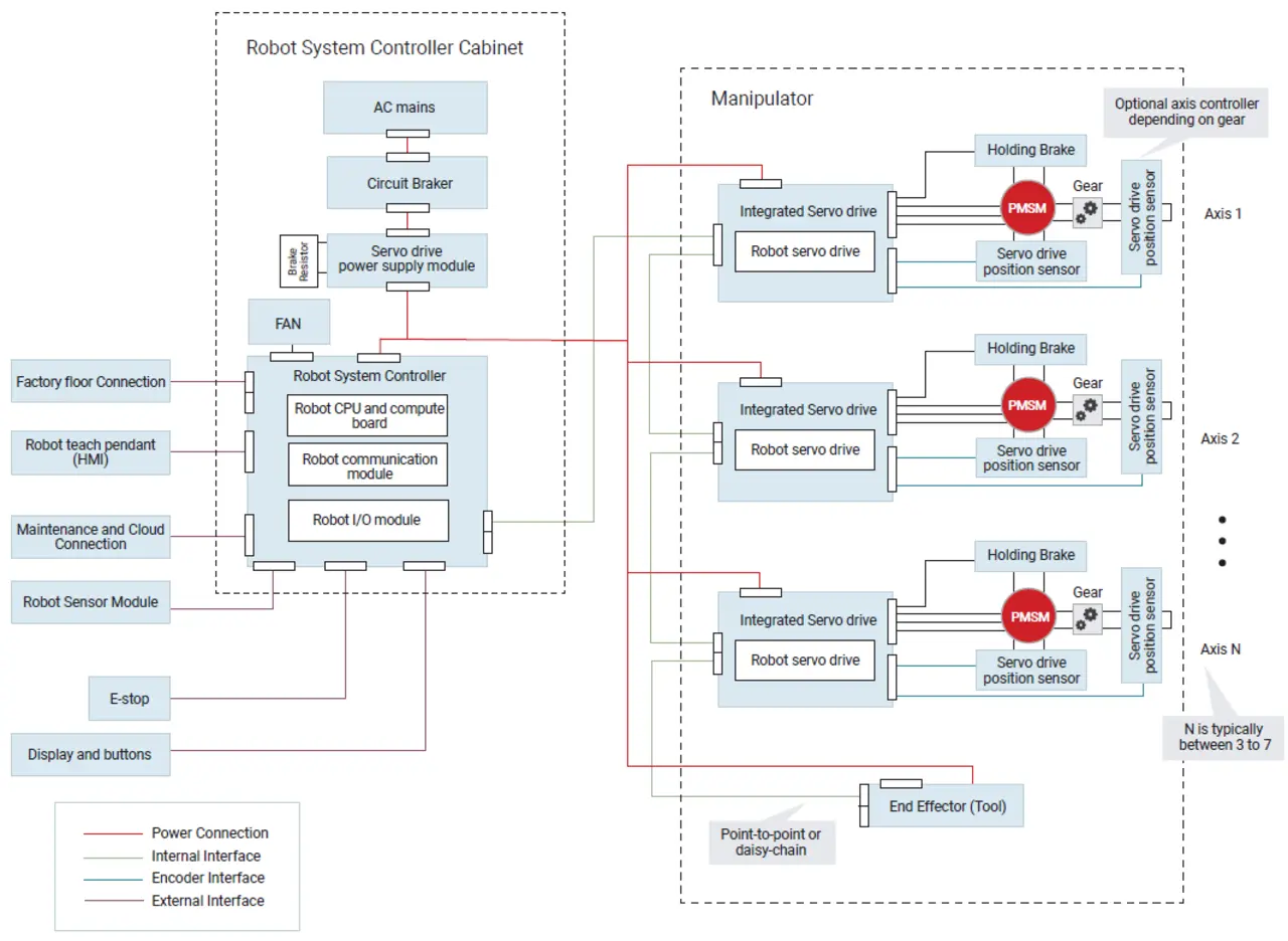 Zentralisierte Steuerungsarchitekturen können die Performance- und Effizienz-Anforderungen automatisierter Hochleistungs-Systeme erfüllen, genau das, was Industrieroboter mit hoher Nutzlast anfordern. Aber sie erfordern zusätzliche Kabelverbindungen zwischen dem Schaltschrank und dem am Gelenk angebrachten Motor sowie zwischen den Positionsgebern und den Aggregatoren. Diese zusätzlichen Leitungen treiben wiederum nicht nur die Kosten in die Höhe, sondern sie sind auch verschleißanfällig und wartungsintensiv.