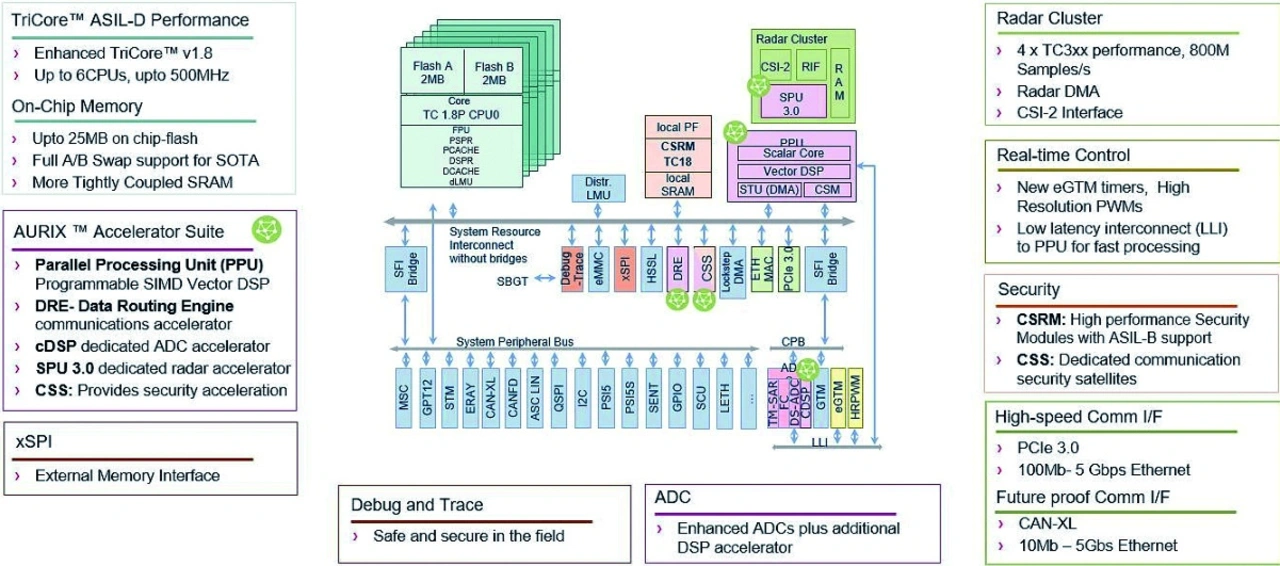 »Zonen-Architekturen benötigen eine höhere Performance und Flexibilität, sie haben hohe Anforderungen an Safety und Security, Interferenzen müssen ausgeschlossen sein und das Angebot an Konnektivität muss höher sein«, so die Überzeugung von Böhm. Die erhöhte Leistungsfähigkeit und die Safety/Security-Maßnahmen wurden bereits besprochen. Geht es um den Punkt »Interferenzen«, so verweist Böhm darauf, dass die neuen TC4x-Controller auch Hypervisor-Support bieten und bis zu acht virtuelle Maschinen (VMs) unterstützen. Böhm weiter: »Die Anforderungen an eine verbesserte Konnektivität wurden mithilfe neuer High-Speed-Kommunikationsschnittstellen, plus den bekannten Automotive-Bussen und unserem Kommunikations-Beschleuniger ebenfalls erfüllt.«