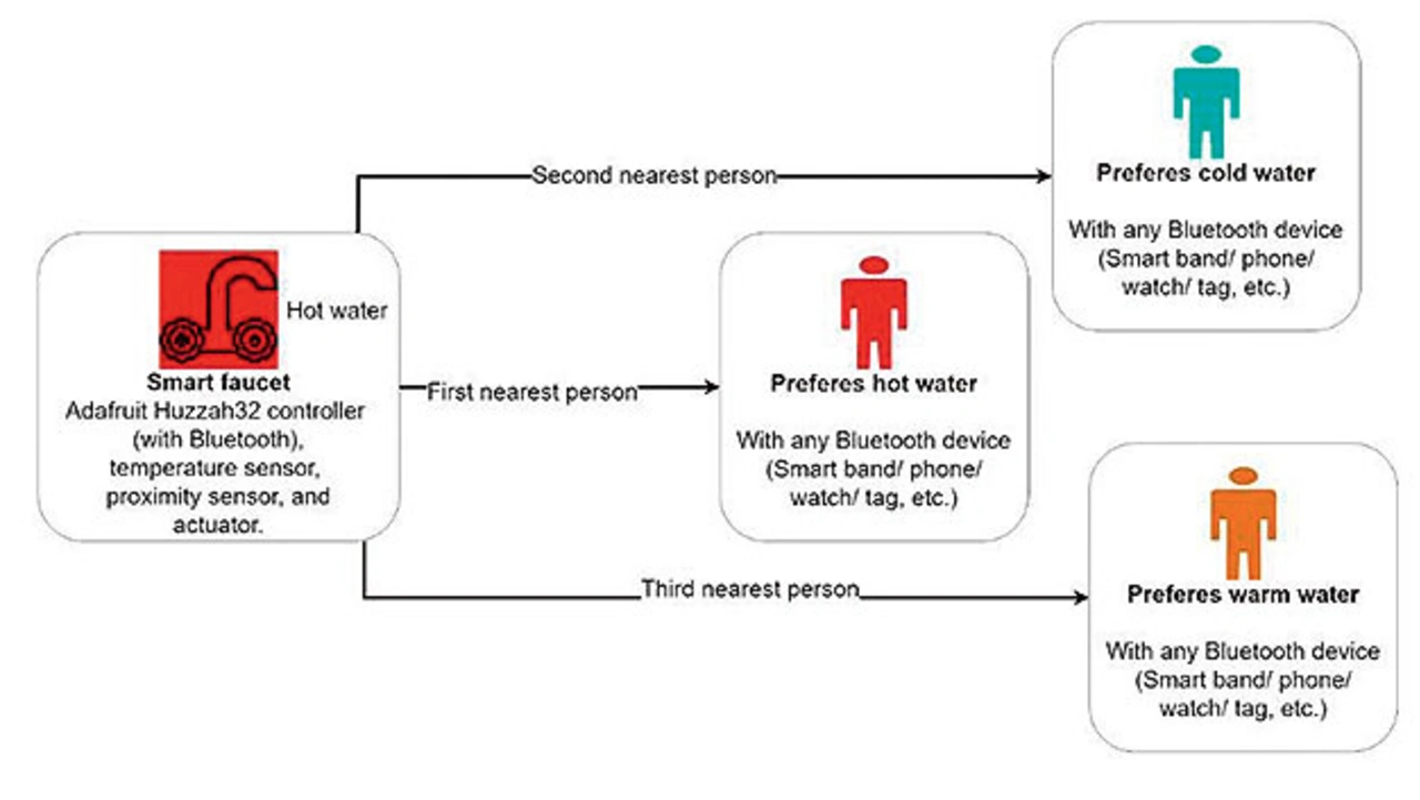 Das System umfasst einen Temperatursensor zur Messung der Wassertemperatur, einen Adafruit Huzzah32 Controller (Bluetooth Low Energy) zur Personenerkennung, einen mechanischen Aktuator zur Betätigung des Heiß- und Kaltwasserventils im Wasserhahn, einen Näherungssensor zur Auslösung des Wasserflusses sowie ein beliebiges Bluetooth-Gerät zum Einstellen der Wassertemperatur (z. B. Smartphone oder Smartwatch).