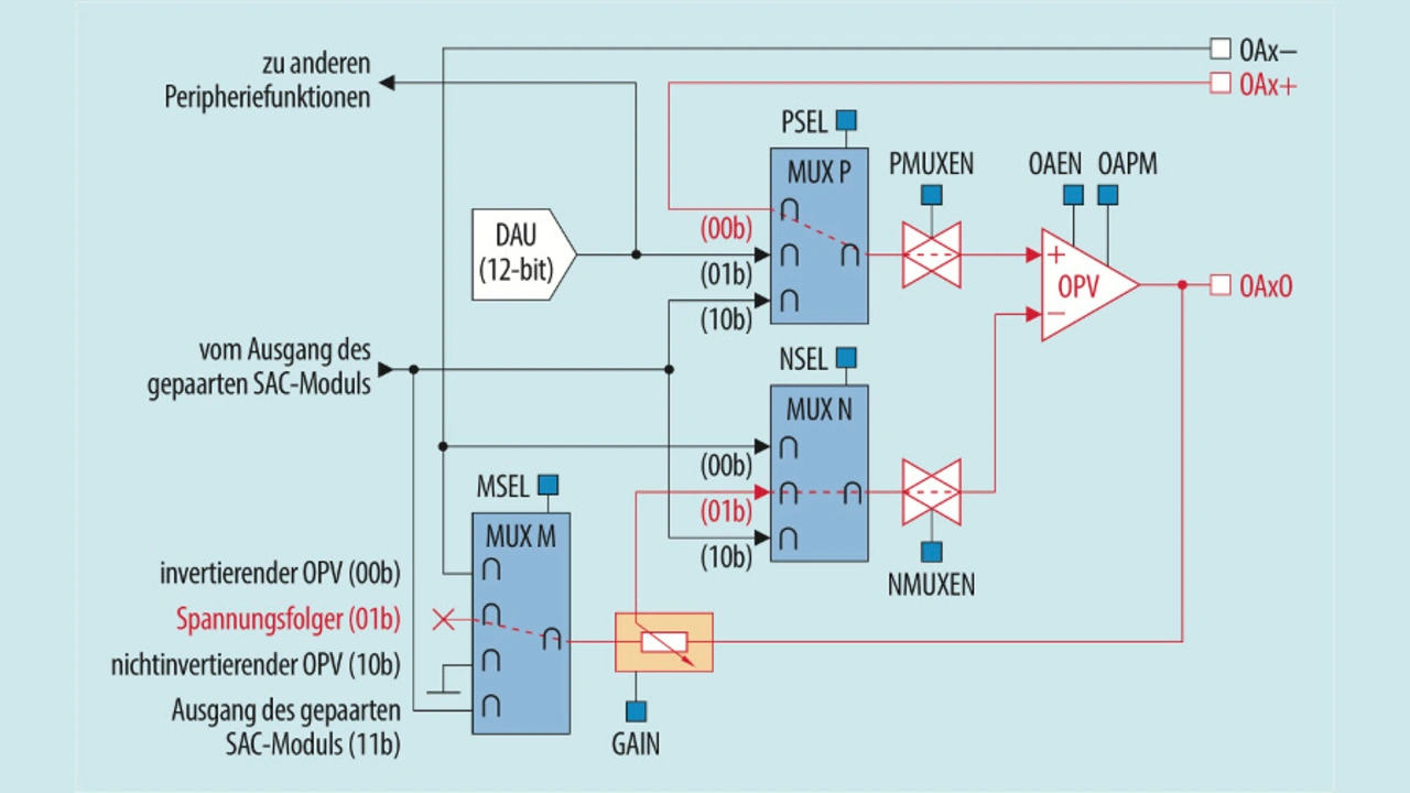 Der rot hervorgehobene Teil der Schaltung in Bild 3 verdeutlicht, dass der nichtinvertierende Eingang des OPV über den Multiplexer P mit dem Anschluss für den nichtinvertierenden Eingang (OAx+) verbunden (PSEL = 00b) ist. Zum Puffern eines zweiten internen SAC-Modus (SAC-Puffermodus) würde der Multiplexer P (PSEL = 10b) den nichtinvertierenden Eingang des OPV mit dem Ausgang des SAC-Moduls verbinden, mit dem dieses SAC-Modul als Paar zusammenarbeitet.