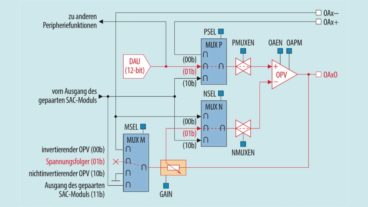 In Bild 6 sind die Elemente für den DAU-Betrieb eines SAC-Moduls rot hervorgehoben. In der DAU-Betriebsart müssen der DAU und der OPV gemeinsam aktiviert sein, und der Multiplexer M wird auf die Stellung „Spannungsfolger“ geschaltet, sodass die Ausgangsspannung des OPV ungedämpft an den invertierenden Eingang des OPV geführt wird.
