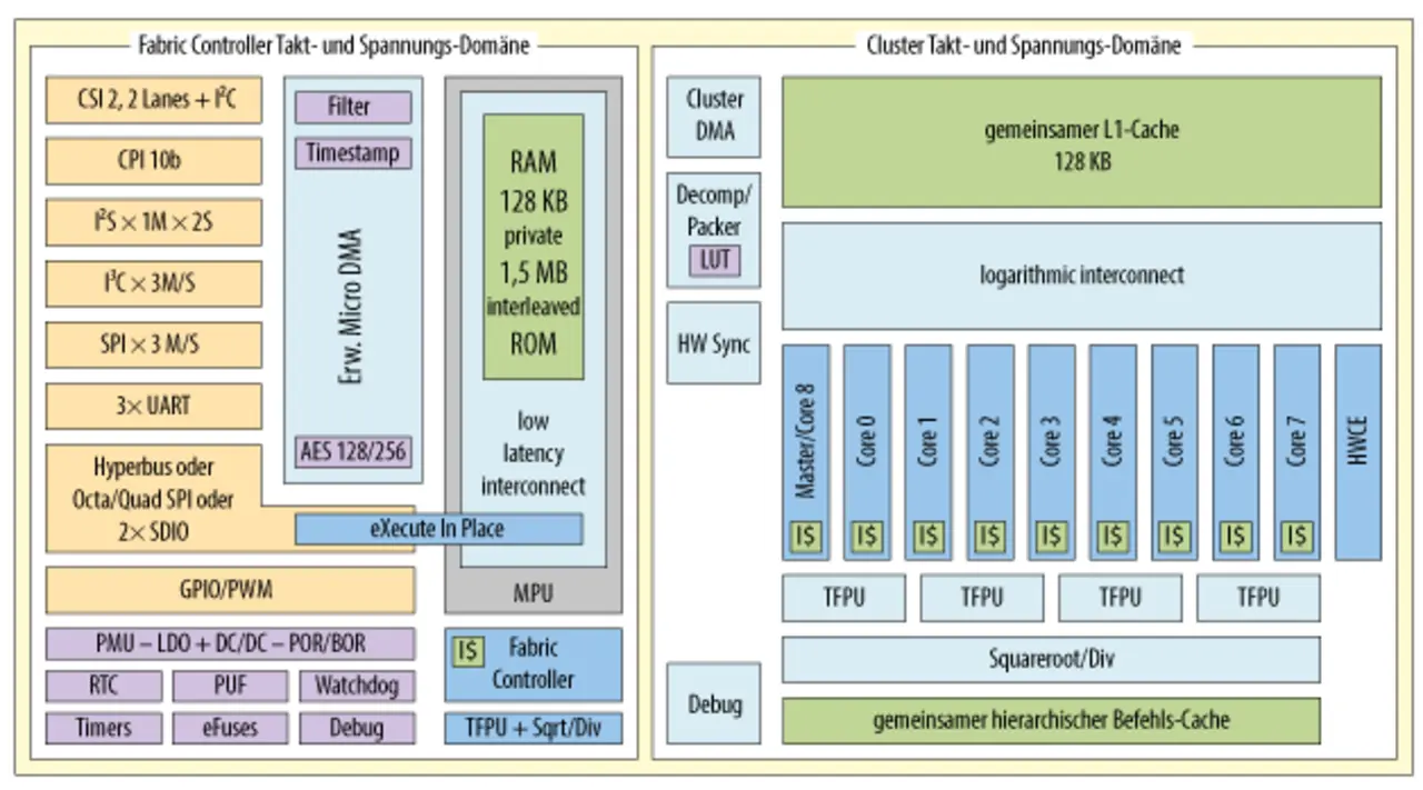 Im letzten Jahr hatte das französische Fabless-Halbleiterunternehmen GreenWaves mit dem GAP8 einen KI-Mikrocontroller vorgestellt, der acht RISC-V-Cores in einer parallelen Anordnung enthält sowie einen weiteren Core, der als klassischer Mikrocontroller die Steuerfunktionen ausübt und von GreenWaves als Fabric-Controller bezeichnet wird. Die acht parallelen Cores sind für die Ausführung neuronaler Netze optimiert. Sie ermöglichen den Betrieb intelligenter Geräte, die Daten aus Bild-, Ton- oder Vibrationssensoren erfassen, analysieren, klassifizieren und daraus Aktionen ableiten. Anwendungen können Bilderkennung, Zählen von Personen und Objekten, Überwachung des Maschinenzustands, Haussicherheit, Spracherkennung, Hausroboter und intelligente Spielzeuge sein.