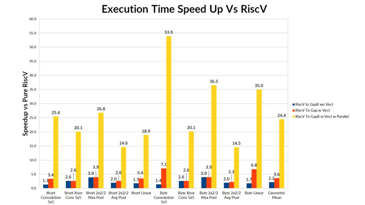 Mit dem GAP8-SDK können GAP8-Anwendungen compiliert und ausgeführt werden. Auf Github enthaltene Benchmarks dokumentieren die Leistungsfähigkeit dieser GAP8-Implementierung [16]. Aus Bild 6 wird sichtbar, dass GAP8 von allen drei Optimierungsstufen profitiert. Der Performance-Gewinn durch die GAP8-ISA-Extensions, Vectorization und Parallelisierung liegt zwischen 14,5 und 53,9. So dauert bei maximaler GAP8-Taktfrequenz ein »5×5 byte convolutional layer on a 112×112 grayscale input image with 100 output filters« auf einem GAP8 12,8 ms, während das auf einem Single-Core-Standard-RISC-V-ISA 729,4 ms dauern würde.