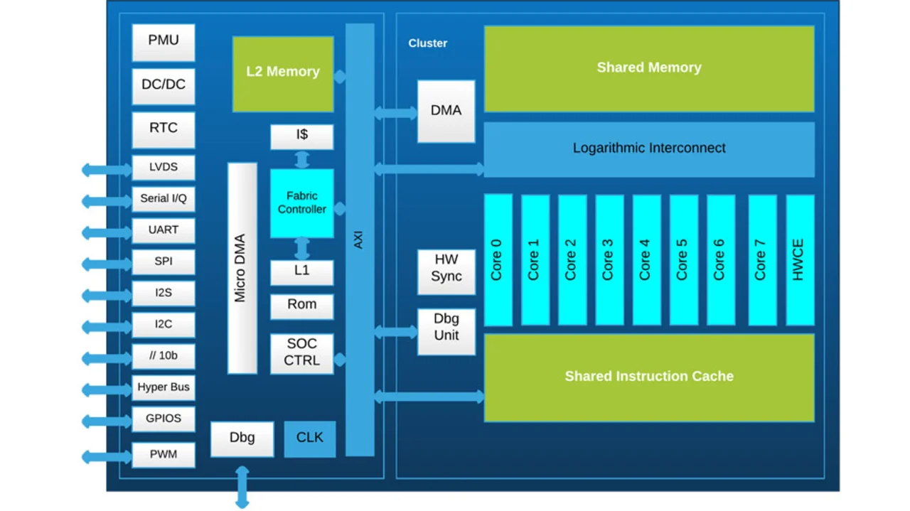 Ein Blockdiagramm des GAP8-SoC zeigt Bild 5. Alle neun Cores in Bild 5 weisen die gleiche ISA-RV32IMC und Teile des Supervisor-ISA-Subsets auf. Diese Standard-Extensions werden durch spezifische Instruktionen ergänzt, die der Performance-Optimierung beim Signal-Processing und Machine-Learning u. a. m. dienen. Weitere Details sind im GAP8-Hardware-Reference-Manual [15] zu finden.