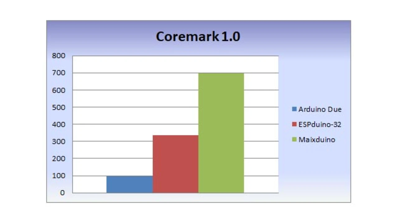 Um die Performance des MAIX M1 gegenüber anderen Arduino-Mikrocontrollern zu bewerten, habe ich zwei Benchmarks laufen lassen [23]: das Sieb des Eratostenes und CoreMark, ein vom EEMBC empfohlener Test, der zudem an die Arduino-Umgebung angepasst ist. Der Vergleich mit dem Arduino Due zeigt, dass schon der ESP32 eine deutliche Verbesserung bringt, die vom MAIX M1 nochmal wesentlich überboten wird (Bild 4).