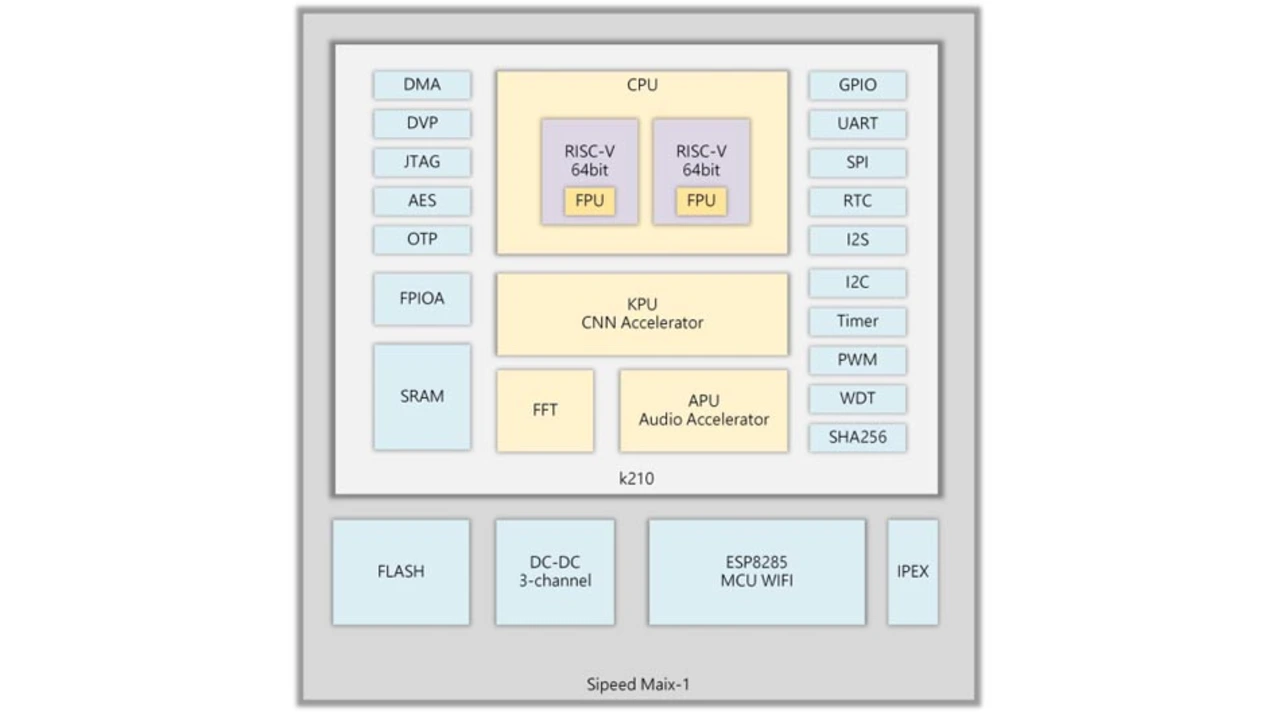 MAIX ist ein von Sipeed entwickeltes Modul, mit dem KI-Aufgaben sensornah ausgeführt werden können. Die MAIX-CPU enthält einen auf dem Rocket-Core basierenden Dual-Core-64-bit RISC-V-Prozessor Kendryte K210 (RV64IMAFDC), der mit bis zu 400 MHz getaktet werden kann und folgende Hardware-Erweiterungen on-board hat: