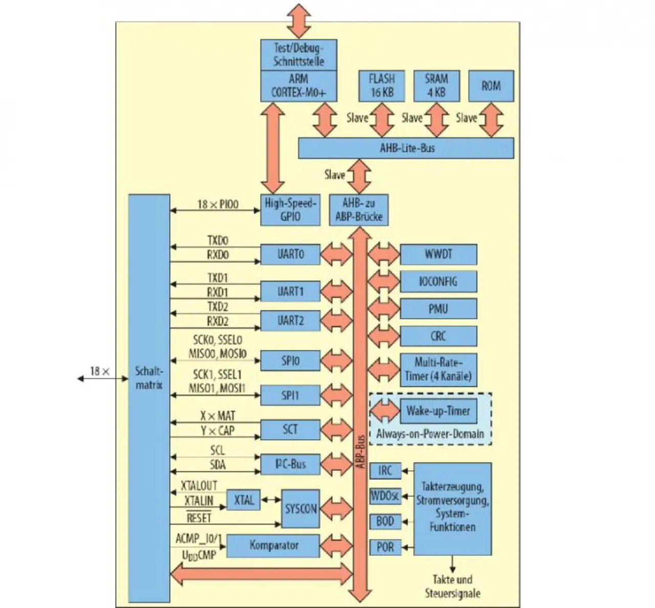 Minimalistisch ist auch die Busstruktur auf dem Chip. Während Flash-Speicher, ROM und ROM wenigstens noch über einen AHB-Lite-Bus mit dem Core kommunizieren dürfen, sind die seriellen Schnittstellen, Timer, Komparator und Power-Management-Einheit über den APB (Advanced-Periphal-Bus) angebunden, Teil des von ARM bereits 1996 eingeführten AMBA-Busses, der mit seiner 32 bit Busbreite maximal Signale mit 66 MHz unterstützt – was im Fall des .LPC800 aber natürlich vollkommen ausreichend ist,