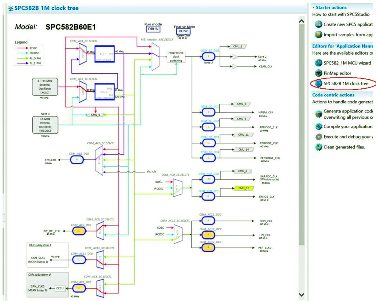 In der Ansicht »Common Tasks« kann der Menüpunkt »MCU clock-tree« aktiviert werden. In Bild 2 ist die Taktbaum-Struktur des Mikrocontrollers SPC582B zu sehen, um zu demonstrieren, wie sich Taktparameter wie etwa Prescaler und PLLx-Werte einstellen lassen, ohne dass dazu auf die Taktkonfigurations-Register zugegriffen werden muss. SPC5-Studio markiert alle Inkonsistenzen, sodass sich Konfigurationsfehler schnell einkreisen lassen.