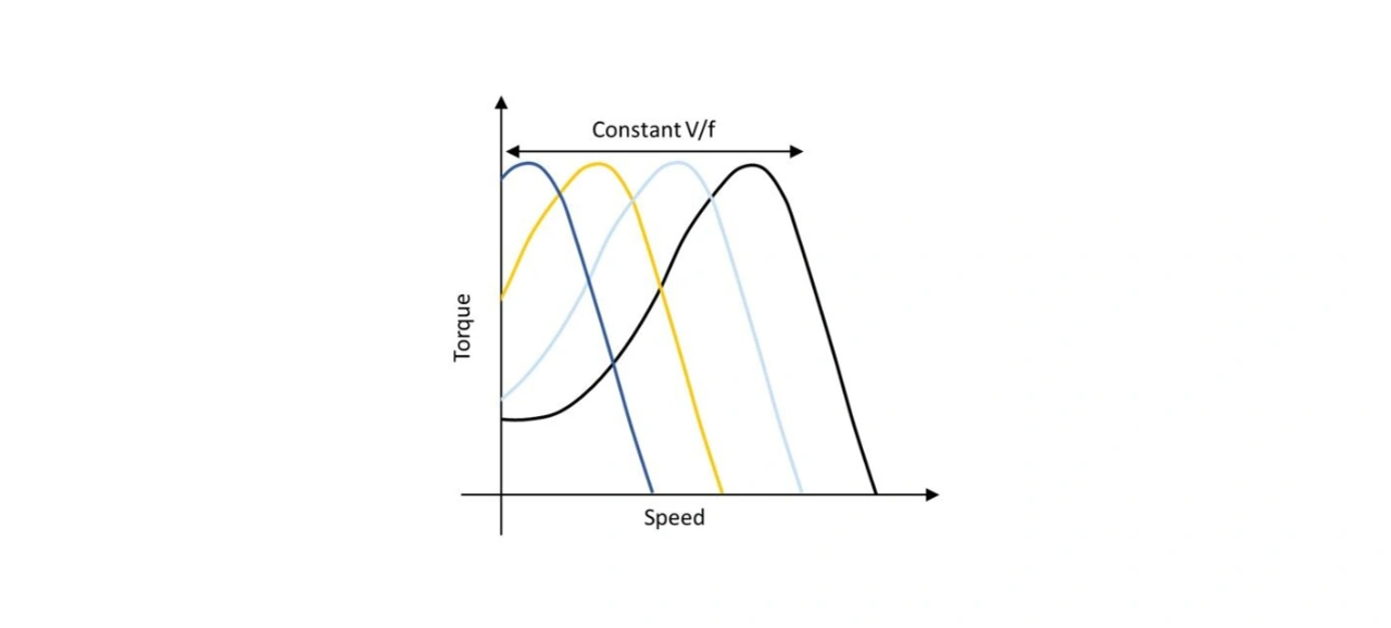 Skalare Steuerung: Bei den meisten bestehenden drehzahlvariablen Antriebssystemen handelt es sich um Antriebe mit geringer Leistung, die die Frequenzhöhe der Statorspannung oder des Statorstroms steuern. Die Steuerung erfolgt durch Aufrechterhaltung eines konstanten Magnetfelds im Motor. Die am häufigsten verwendete skalare Steuerungsmethode ist die Konstant-Spannung/Frequenz-Steuerung (U/f-Steuerung). Dabei wird die Größe der Statorspannung proportional zur Frequenz angepasst, wodurch der Statorfluss im Motor konstant gehalten wird. Obwohl skalare Steuerungsmethoden relativ einfach umzusetzen sind, eignen sie sich nicht für Anwendungen, bei denen Transienten auf der Lastseite auftreten. Nachstehend sind die typischen Motoreigenschaften aufgeführt, die sich mit der V/f-Steuerung erzielen lassen.