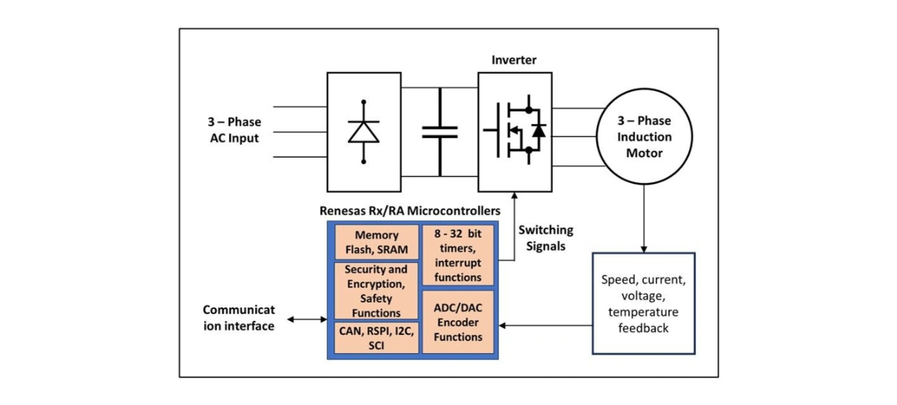 Abbildung 4 zeigt einen typischen Induktionsmotorantrieb und seine Hauptkomponenten. Die Induktionsmotorantriebe werden von einer dreiphasigen Wechselstrom-Eingangsversorgung gespeist, die durch eine Gleichrichtereinheit in Gleichspannung umgewandelt wird. Um die Spannungsschwankungen zu reduzieren, werden DC-Link-Kondensatoren über diese Ausgangsgleichspannung gelegt. Die Gleichspannung wird dann in den Wechselrichter eingespeist. Dieser wandelt sie auf der Grundlage der Schaltsignale, die von der MCU empfangen werden, wieder in Wechselspannung für den Induktionsmotor um. Die MCU, das Gehirn des Antriebs, spielt eine entscheidende Rolle bei der Bestimmung der Leistung und Effizienz des Induktionsmotorantriebs. Die MCU-Serien RA-T und RX-T von Renesas wurden speziell für IM-Antriebsanwendungen entwickelt. Sie verfügen über spezifische Funktionen, die bei der Entwicklung von Hochleistungsantriebssystemen unterstützen. Im Folgenden werden einige wichtige Merkmale dieser MCUs vorgestellt.