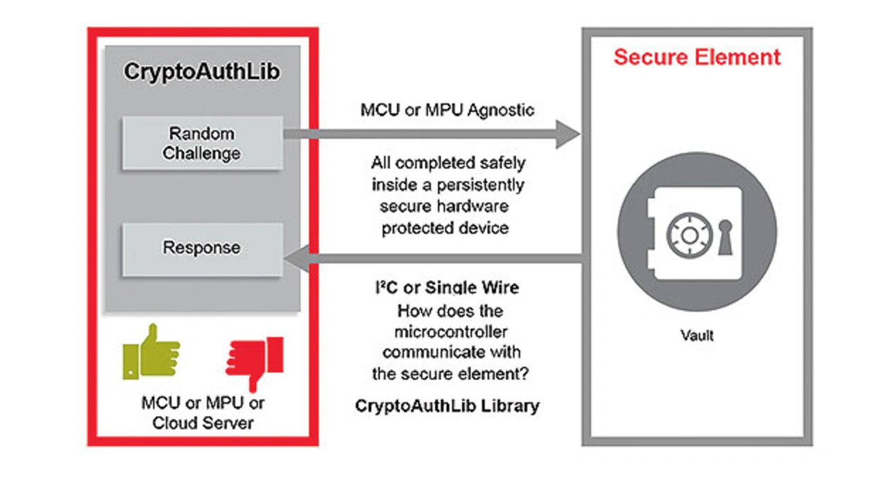 Aufgrund ihrer zentralen Rolle dürfen die geheimen Schlüssel des Geräts weder für physische Angriffe noch für Angriffe über das Netzwerk anfällig sein. Im Idealfall werden die kryptografischen Schlüssel in einem Sicherheits-IC (Secure Element) gespeichert, das eine isolierte sichere Grenze auferlegt, sodass die Schlüssel niemals offengelegt werden (Bild 1). Dies ist nicht ganz einfach. Die Schaltung erfordert