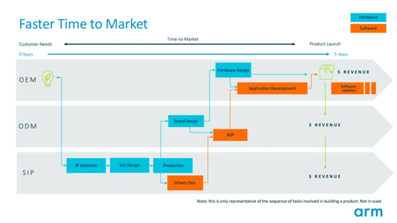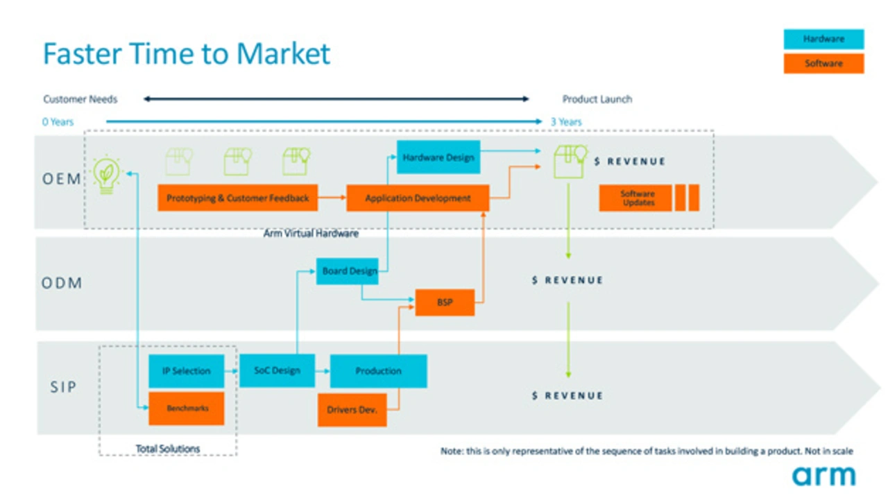 Mit genauen Modellen von ARM-basierten SoCs, die Mechanismen für die Simulation von Speicher, Peripherie und mehr bieten, ist die Entwicklung und das Testen von Software nun möglich, bevor der Chip verfügbar ist. Dadurch soll es gelingen einen typischen Produktentwicklungszyklus von durchschnittlich fünf Jahren auf nur drei Jahre zu verkürzen (Bilder 2 und 3). Virtual Hardware ermöglicht den Halbleiterpartnern von ARM, Kundenreaktionen für Chips vor der Markteinführung zu erhalten. Die gesamte IoT-Wertschöpfungskette wird so in die Lage versetzt, auf einfache Weise Code auf dem neuesten IP zu entwickeln und zu testen, lange bevor der Chip verfügbar ist.