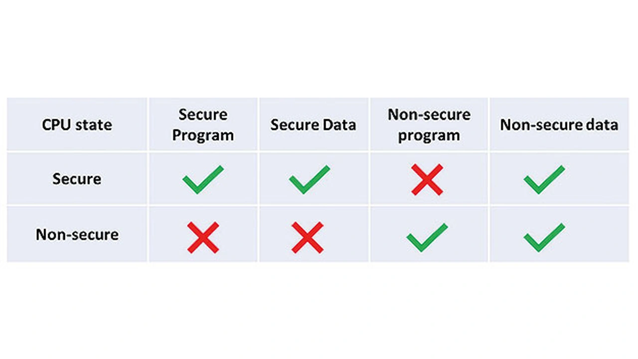 Das hört sich alles sehr gut an, aber wie lassen sich diese sicheren Speicherbereiche und Abgrenzungen definieren? Es gibt zwei Einheiten, die parallel abgefragt werden: die SAU (Security Attribution Unit) und die IDAU (Implementation-Defined Attribution Unit). Bei jedem CPU-Zugriff antworten beide mit dem Security-Attribut, das mit dieser Adresse verbunden ist. Ihre kombinierte Antwort definiert das endgültige Adressattribut, wobei das restriktivste der beiden sich durchsetzt – ein sicherer Bereich kann nicht durch ein weniger sicheres Attribut außer Kraft gesetzt werden. Schließlich wird das Ergebnis anhand der in Tabelle 1 definierten Richtlinie bewertet. Wenn der Zugriff legitim ist, kann er fortgesetzt werden, andernfalls wird er blockiert und eine Exception ausgelöst.