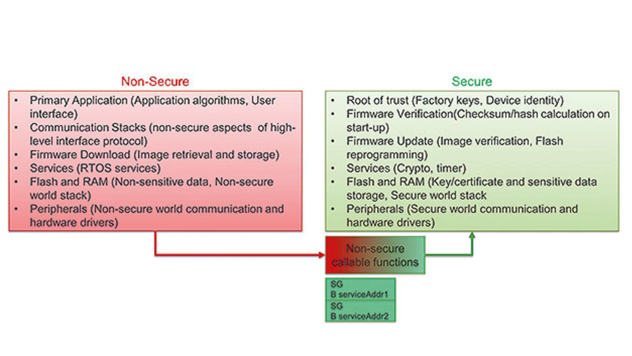 Embedded-Systeme sind stark Interrupt-gesteuert: wenn ein »nicht sicherer« Interrupt auftritt, während sich die CPU im sicheren Modus (»Secure Mode«) befindet, werden die Register standardmäßig auf dem sicheren Stack gespeichert und ihr Inhalt wird automatisch gelöscht. Damit soll verhindert werden, dass Informationen aus dem sicheren Bereich unbeabsichtigt preisgegeben werden. Die Aufteilung der Exceptions innerhalb jeder Systemumgebung wird durch eine eigene Interrupt-Vektortabelle für jede Systemumgebung unterstützt. In ähnlicher Weise gibt es eine separate Implementierung der Stack-Pointer, Systick-Timer usw.