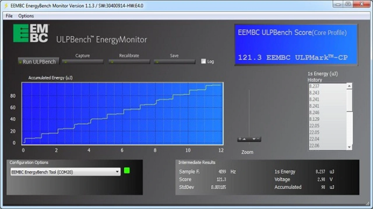 Der MSP430FR5969 16-Bit-Mikrocontroller von Texas Instruments ist mit FRAM (Ferroelectric RAM) ausgestattet, welches für Ultra-Low-Power, lange Lebensdauer und hohe Schreibgeschwindigkeit bekannt ist. Das MSP-EXP430FR5969 LaunchPad Development Kit (http://www.ti.com/tool/MSP-EXP430FR5969) ist ein Evaluation-Modul für den MSP430FR5969 Mikrocontroller. Das Dokument „Getting Started With EEMBC ULPBench on MSP-EXP430FR5969“ bietet sehr detaillierte Unterstützung bei der Durchführung des Benchmarks. Empfohlen wird hier die Verwendung der IAR Embedded-Workbench-Kickstart-Free-8-KB-Version, die von der IAR-Website heruntergeladen werden kann. Eine Registrierung bei IAR ist erforderlich. Das Resultat des EEMBC ULPBench für den MSP430FR5969 zeigt das Bild. Ein Wert von 121 ist gut, reicht aber trotz FRAM nicht zum Spitzenplatz. Warum dies so ist, erklärt der nächste Test.