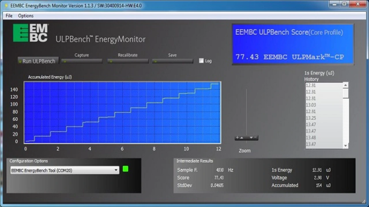 Nach einer Telefonkonferenz mit Microchip konnten die Optionen für die Messungen geklärt werden. Wichtig beim Messen ist, dass der Controller nicht im DebugMode ist, man muss also den Debugger disconnecten, alle Jumper bis auf JP9 entfernen und dann den EnergyMonitor an J10 2&3 anschließen. Nur so kann eine parasitäre Stromaufnahme verhindert werden. Das Resultat des EEMBC ULPBench für den PIC24FJ64GA202 unter den geschilderten Bedingungen zeigt das Bild. Mit einem Wert von 77,43 kann sich der PIC nicht in der Spitzengruppe einordnen, was an der vergleichsweise rechenschwachen CPU liegt, die den Controller über eine relativ lange Zeit in den energiehungrigen aktiven Modus zwingt.