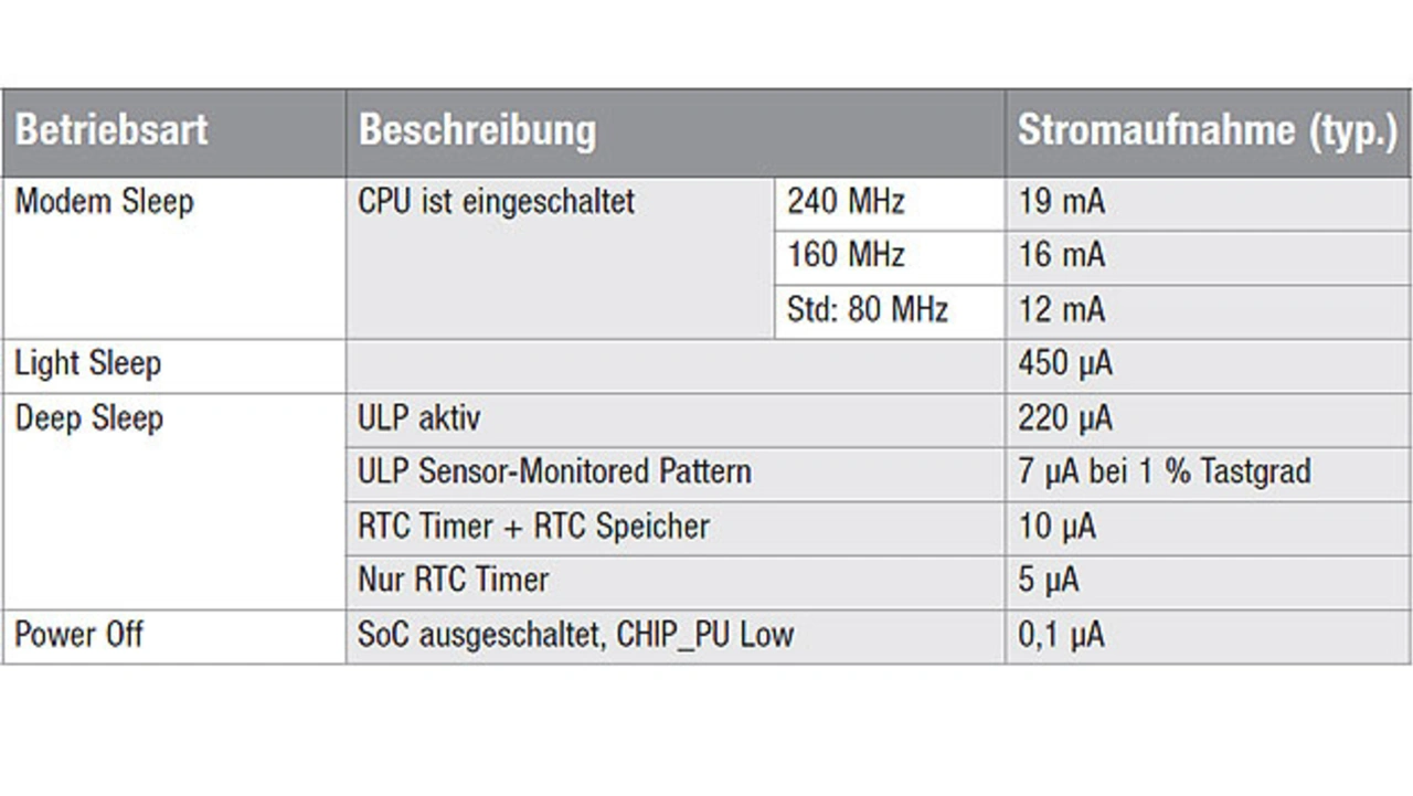Letztlich ist natürlich entscheidend, welche Stromaufnahme durch das gesamte Power-Management des ICs realisierbar ist (Tabelle). Für die Stromaufnahme im Tiefschlafmodus gibt Espressif einen Wert von 7 µA an, dabei ist der Touch-Sensor mit einem Tastgrad von 1 % aktiv – zum Aufwecken. Der ESP32-DxWD dagegen zieht unter vergleichbaren Bedingungen 100 µA, insofern also eine erhebliche Reduktion der Stromaufnahme – und notwendige Voraussetzung, um das Versprechen batteriebetriebener Geräte einzulösen.